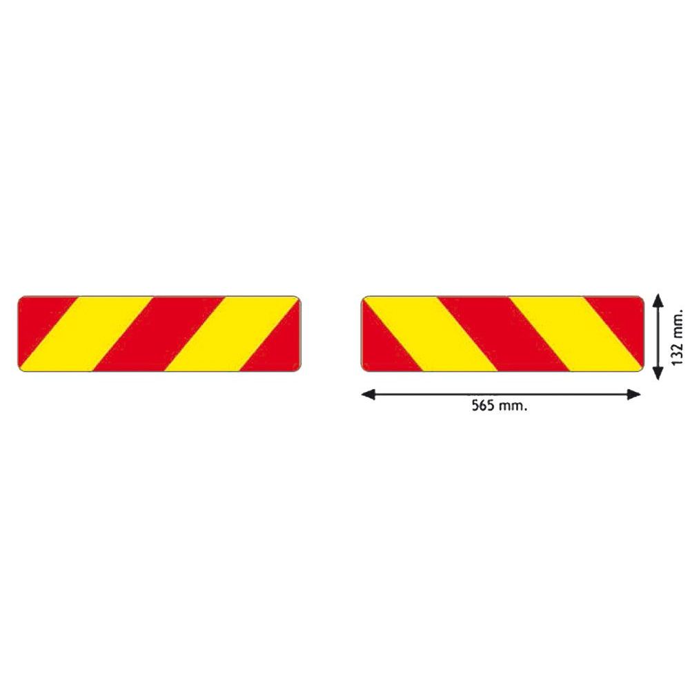 gelb/rot schraffiert, 2 Stk., homologiert ECE 70.01 (stärker reflektierend als Vorgänger mit ECE 70.00)Abmessungen565 x 132 mmBefestigungselbstklebend