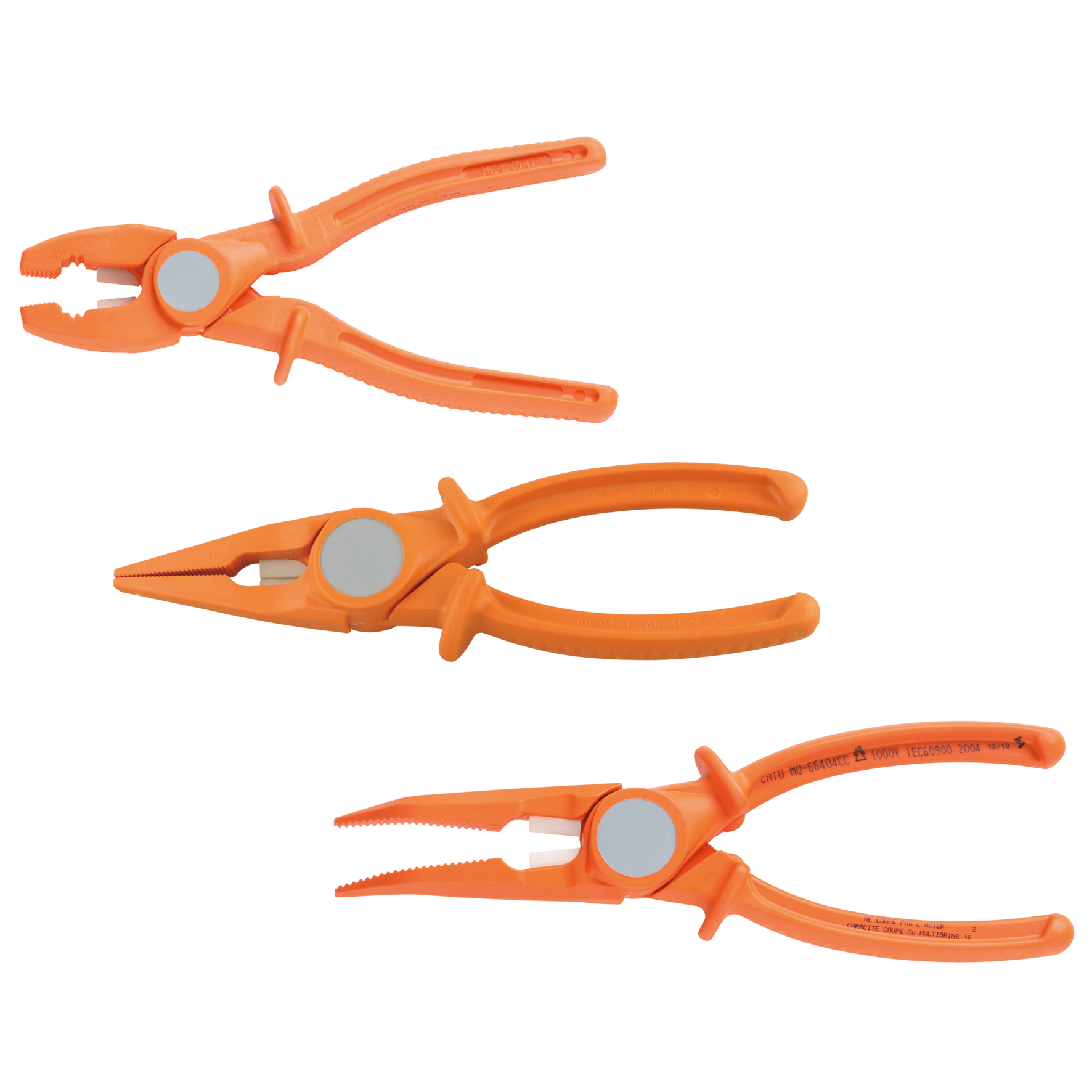 3er-Set vollisolierte Zangen für Arbeiten unter Spannung. Profi Ausführung aus glasfaserverstärktem Kunststoff. Set beinhaltet: - Kombizange CA66000C - Spitzzange gerade...