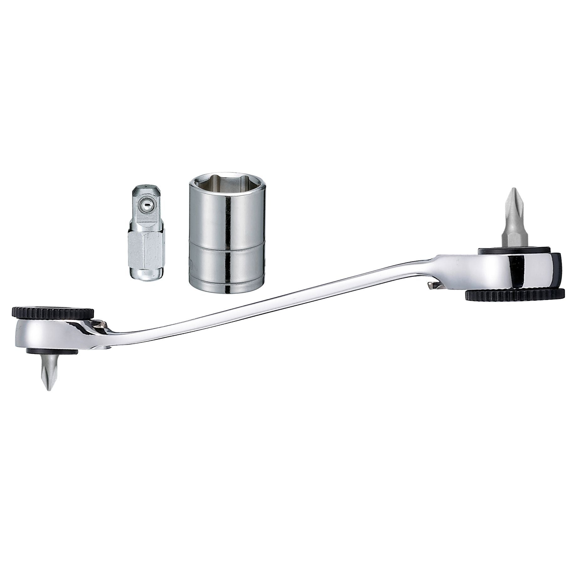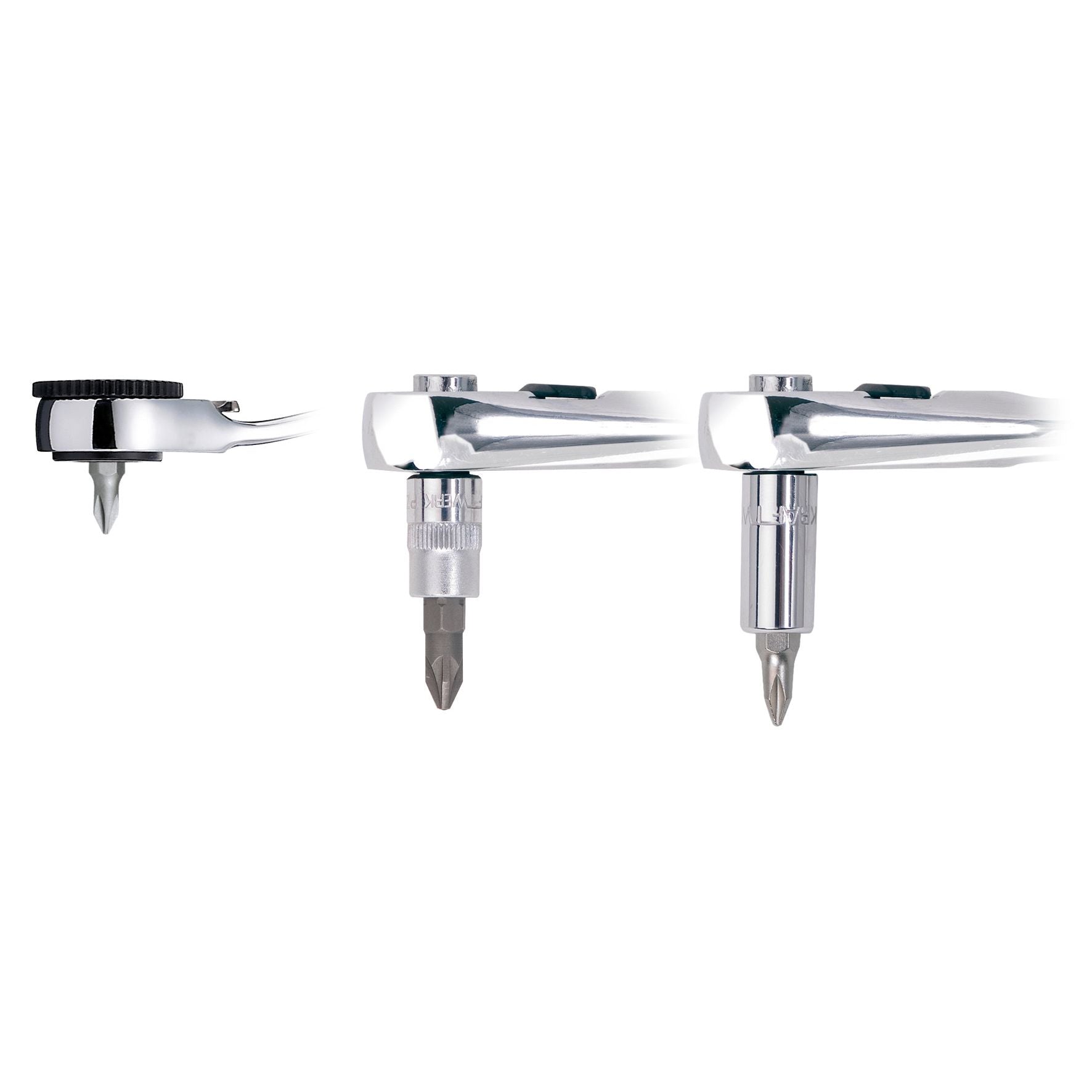 Zweiseitig umschaltbar und 15° abgewinkelt, zur direkten Aufnahme von 1/4 + 5/16 Bits und 1/4 Steckschlüssel-Einsätzen.