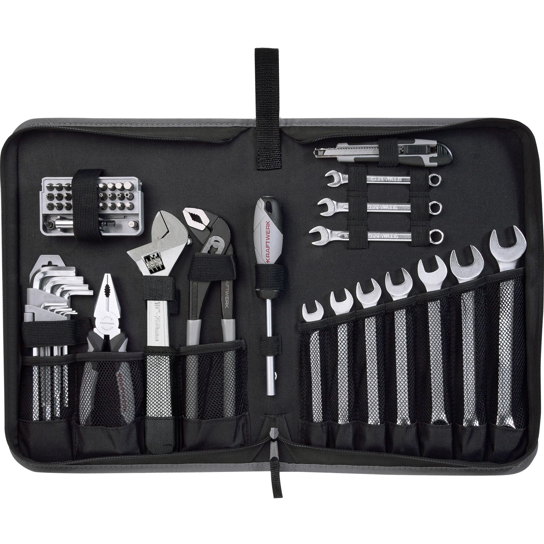 Anwendungsbereich: Werkzeugkoffer, Taschen, Kisten BASIC LINE Werkzeugetui, 57-tlg. 1/4 Steckgriff mit Vierkantheft 1/4 Bit-Satz, 33-tlg. Ring-Maulschlüssel: 8 - 9 -...
