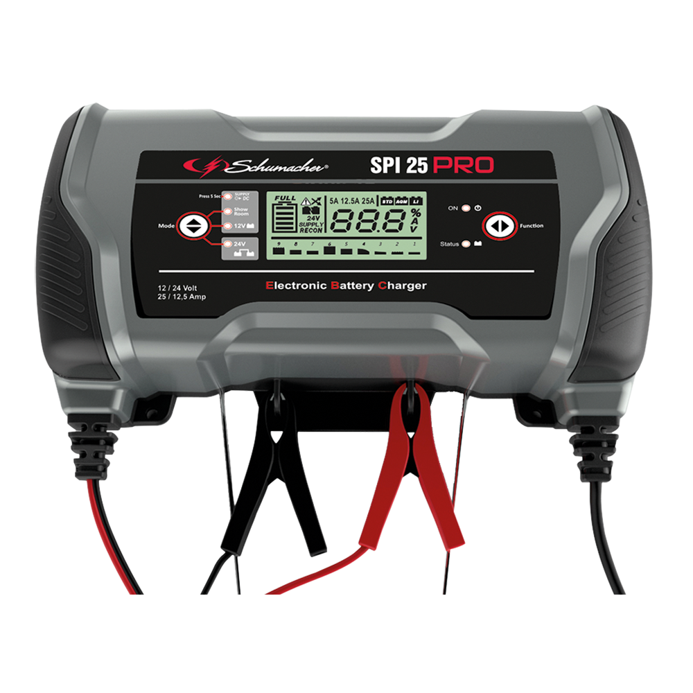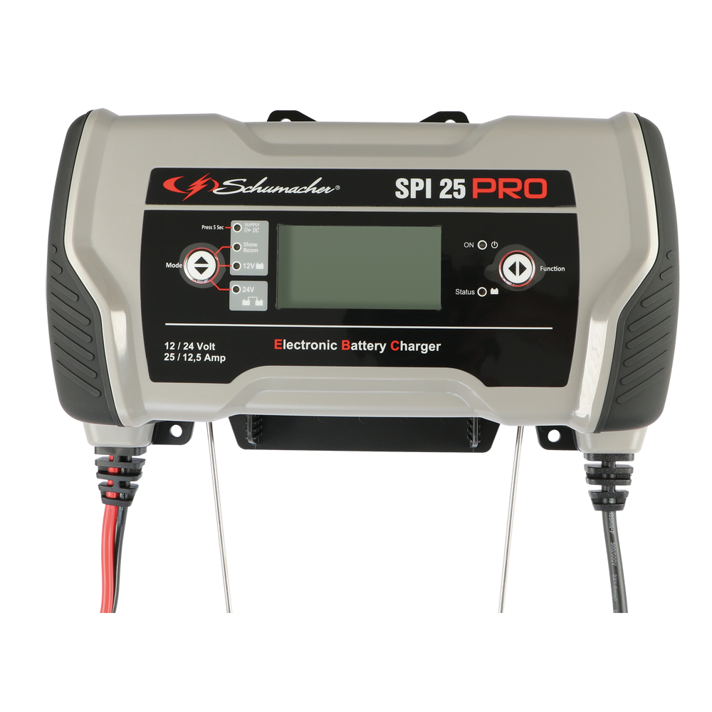 SPI25PRO ist ein 25-Ampère-Ladegerät, welches das Laden automatisch steuert. Es verfügt über verschiedene Funktionen wie Laden, Versorgen und Wiederherstellen und funktioniert sowohl für 12 als auch für 24 V mit einer Kapazität von 5 bis 550 Ah.