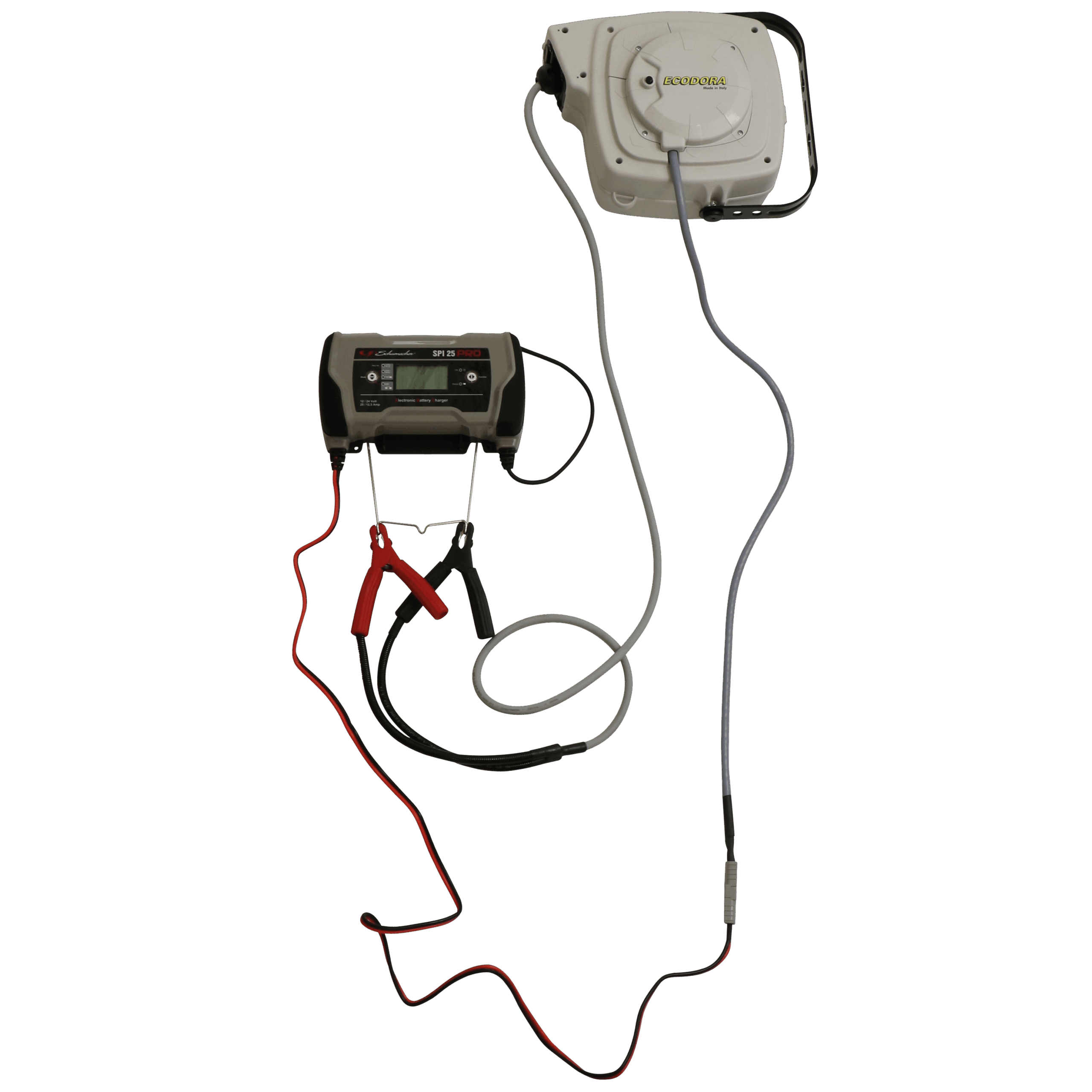 Ladestation SPI25PRO/WS – 12/24 V 25A, mit Ladekabelroller 7 m. SPI25PRO ist ein 25-Ampère-Ladegerät, welches das Laden automatisch steuert. Es verfügt über verschiedene Funktionen wie Laden, Versorgen und Wiederherstellen und funktioniert sowohl für 12 als auch für 24 V mit einer Kapazität von 5 bis 550 Ah. Mit dem High-End Ladekabelroller von ECODORA, Länge 7 m, mit sehr kleiner Ausladung wird diese Konfektion zu einer idealen und sauberen Ladelösung für jeden Arbeitsplatz!