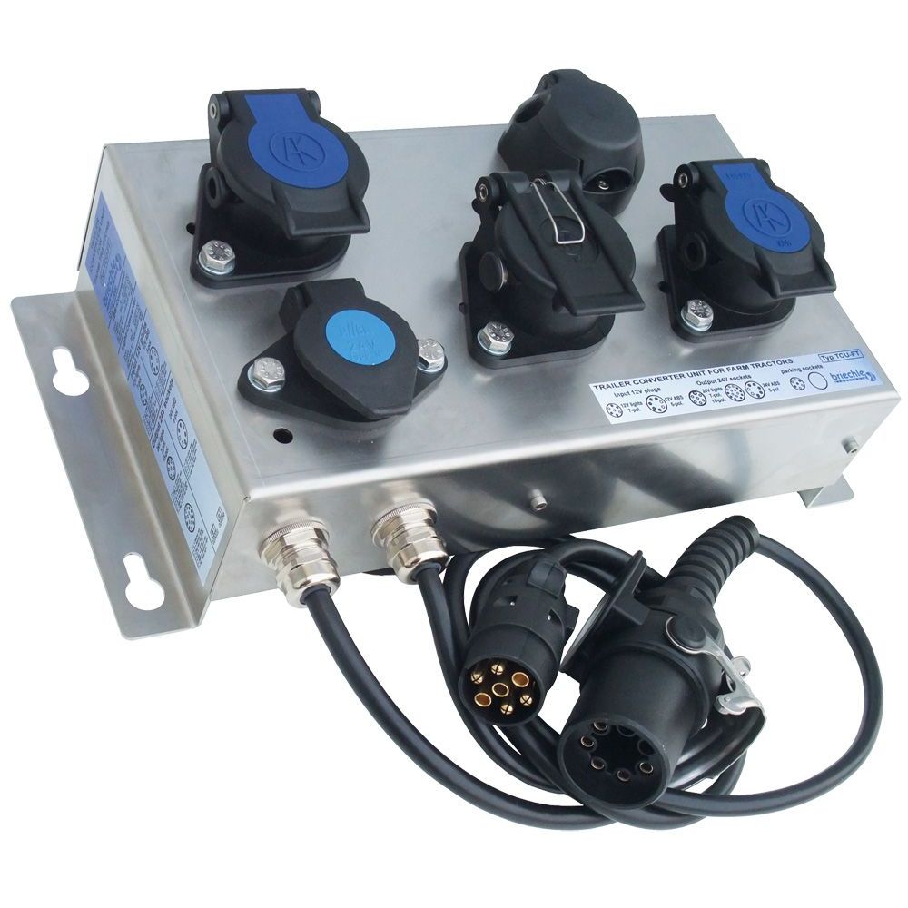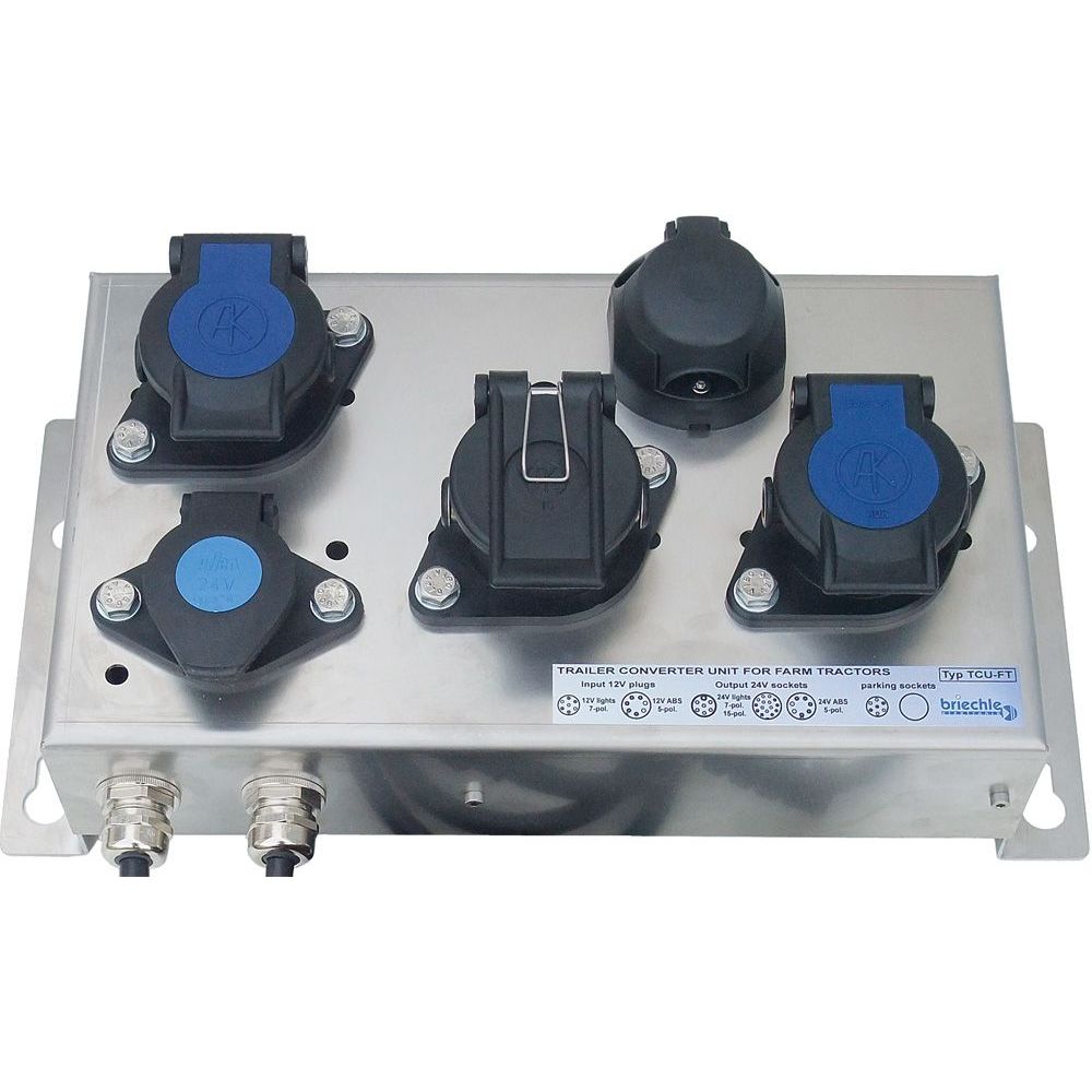 Komplette Wandlereinheit für Landwirtschafts-Traktoren 12 V auf 24 V für Beleuchtung und ABS. Am Eingang sind Stecker und am Ausgang sind Dosen montiert. Parkdosen nehmen bei Nichtgebrauch die freien Stecker auf. Die Einheit ist in einem Edelstahl-Metallträger montiert. Die verwendeten Wandler sind ABS 12-24 und ASV 12-24-6H.