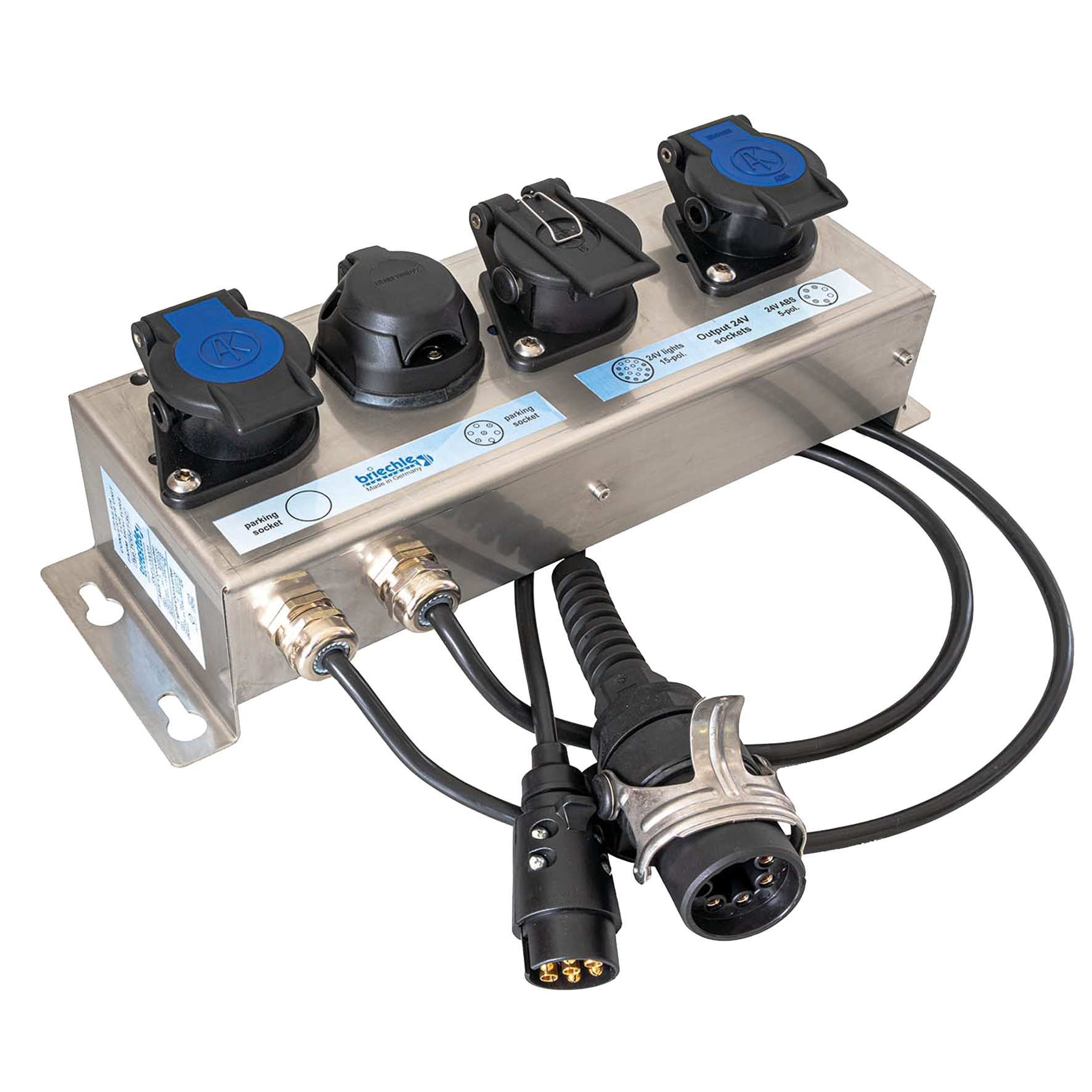 Komplette Wandlereinheit für Landwirtschafts-Traktoren 12 V auf 24 V für Beleuchtung und ABS. Am Eingang sind Stecker und am Ausgang sind Dosen montiert. Parkdosen nehmen bei Nichtgebrauch die freien Stecker auf. Die Einheit ist in einem Edelstahl-Metallträger montiert. Die verwendeten Wandler sind ABS 12-24 und ASV 12-24-6H.