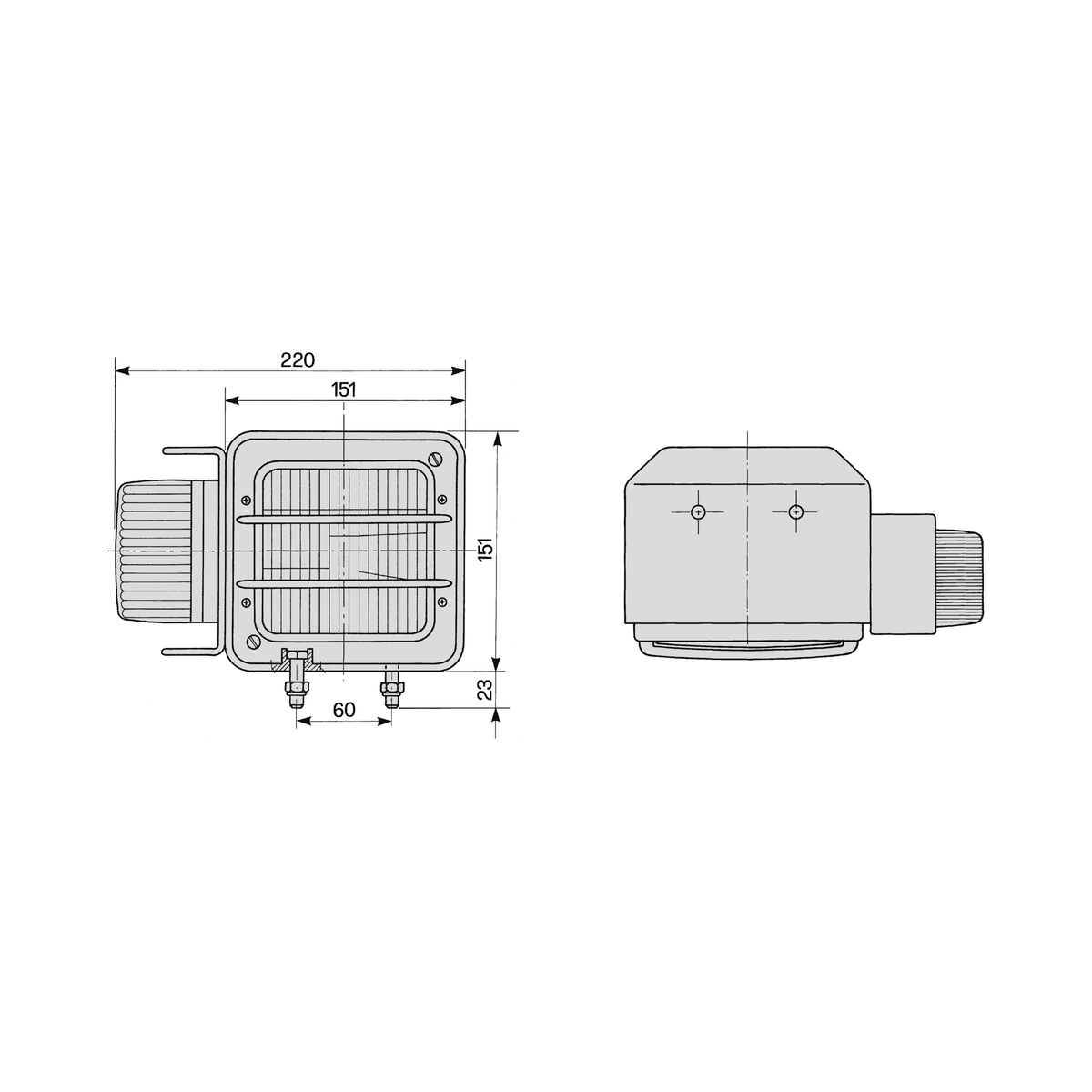 Gehäuse aus Kunststoff, Glashaltering schwarz Bolzenabstand 60mm, 2x M8, rechts ohne Leuchtmittel 05160112, 9EL134660001E-NummerE3-33199, E3-33200Spannung12 VAbmessungen151 x 151 x 220...