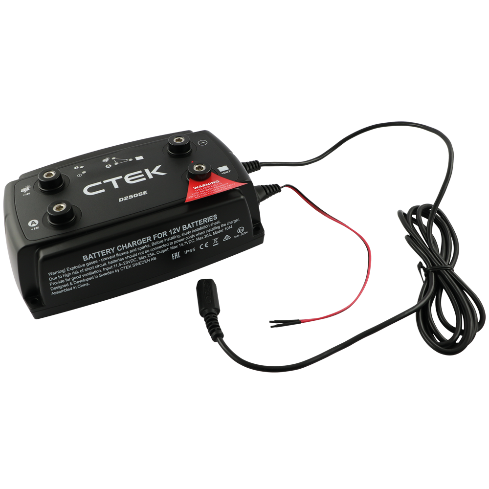 Das D250SE wählt die für den Zweck beste (von 2) angeschlossenen Gleichstromquellen automatisch aus und schaltet zwischen diesen Energiequellen hin und her.
