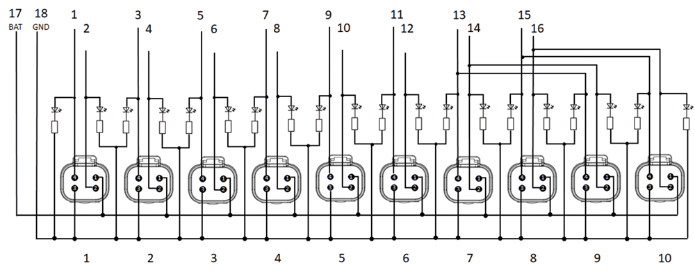 Die Spannungsversorgung erfolgt über einen 18-poligen Deutsch-Stecker, während die Signalverteilung über bewährte 4-polige Deutsch-Stecker realisiert wird. An jedem 4-poligen Stecker sind jeweils ein Versorgungs- und Massepunkt (Pins 1 und 3) gebrückt und über 2 Leitungen mit dem 18-poligen Stecker verbunden – ideal für die Versorgung von Sensoren oder die Masse von Magnetventilen.