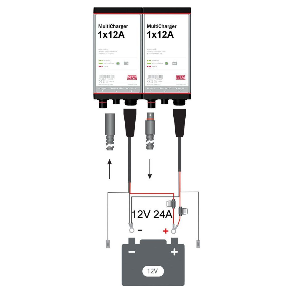 Sie eignet sich für alle Bleisäurebatterien (auch AGM, Gel, Start-Stop) bis 2 x 150 Ah. Mit den DEFA PlugIn Anschlüssen lässt sich das Ladegerät perfekt in das komplette DEFA System integrieren. Der DEFA MultiCharger 2x12A toleriert eine Parallel-Last bis zu 6 Ampere pro Ausgang und lädt gleichzeitig die Batterien.