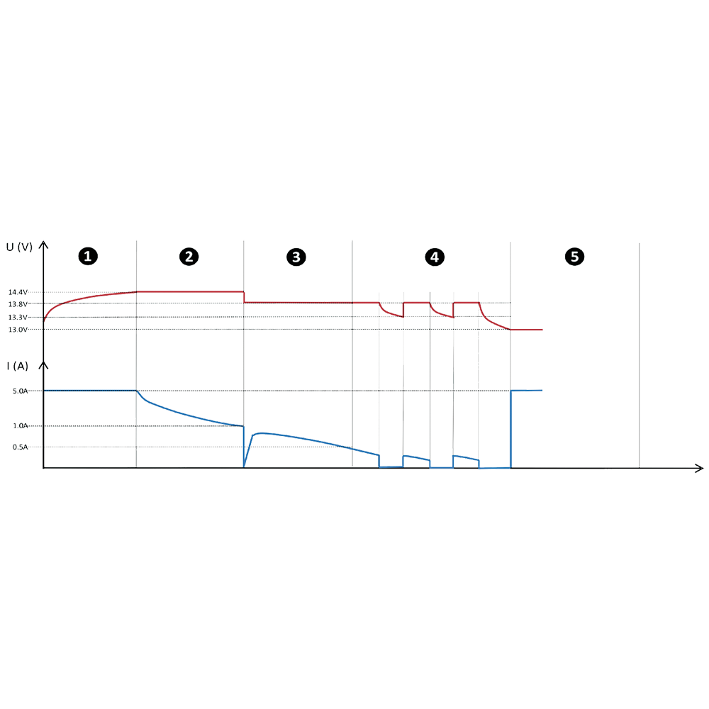 5-stufig, vollautomatisch, für Nass-, MF-, AGM-, Calcium/Calcium- und GEL-Batterien, 50 bis 100 Ah, Metallhalter auf der Rückseite, Kabellänge Ladekabel 1’600...