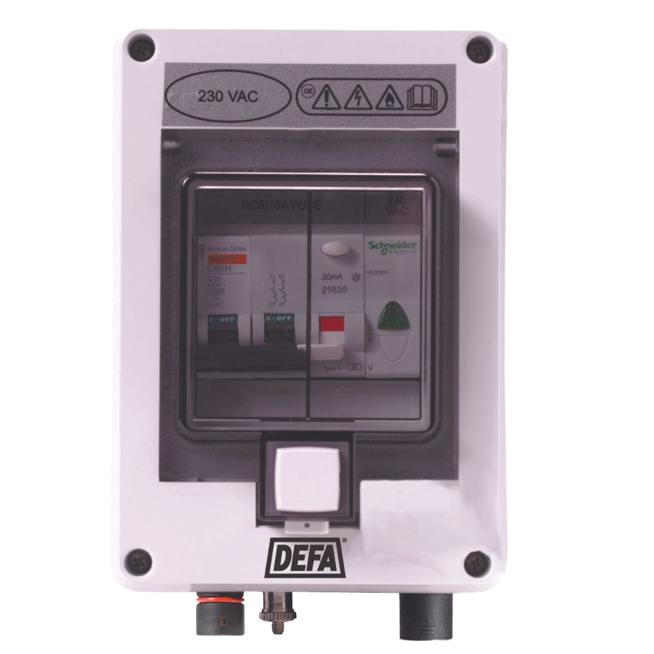 Elektro-Zentrale mit Sicherungen und FI-Schutzschalter 30 mA. Die El-Zentrale (230 VAC / 16 A, IP44) ist mit DEFA PlugIn Anschlüssen ausgestattet. Zwei der drei Ausgänge sind separat schaltbar.