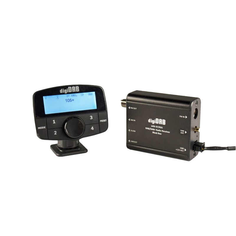 - Der DAB-Empfänger kann versteckt eingebaut werden. Die Steuerung erfolgt komfortabel durch eine kompakte, kabellose Bedieneinheit (batteriebetrieben, sehr geringer Stromverbrauch). Dadurch liegen keine zusätzlichen Kabel im Innenraum.