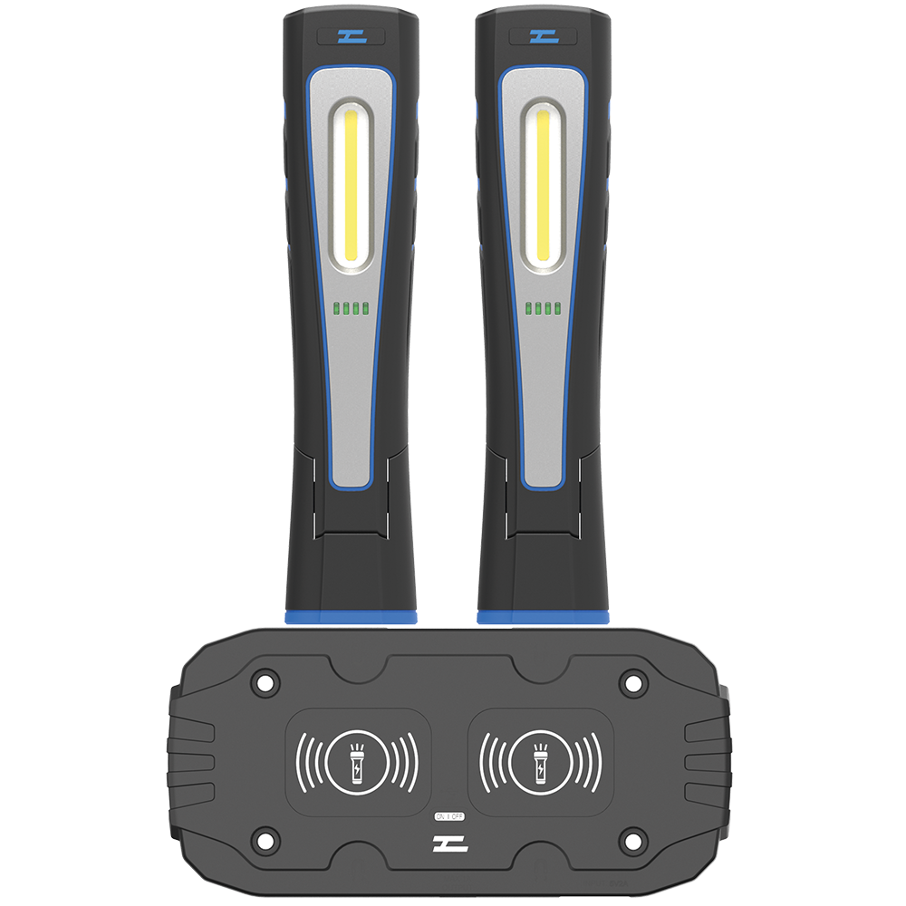 Doppelset COB-LED Handlampe MAXI mit kabellosem Induktiv Ladesystem, Befestigungsmöglichkeit durch starken Magnet-Fuss mit 180° Klapp-Mechanismus sowie 2 Magnethaltern plus Haken...
