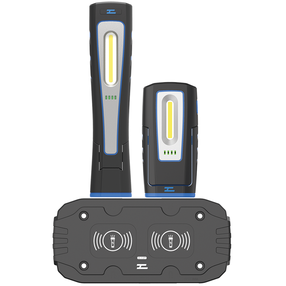 Robuste COB-LED Handlampe MINI und MAXI mit kabellosem Induktiv Ladesystem, Befestigungsmöglichkeit durch starken Magnet-Fuss mit 180° Klapp-Mechanismus sowie 2 Magnethaltern...