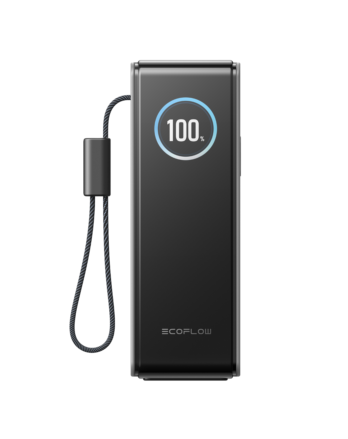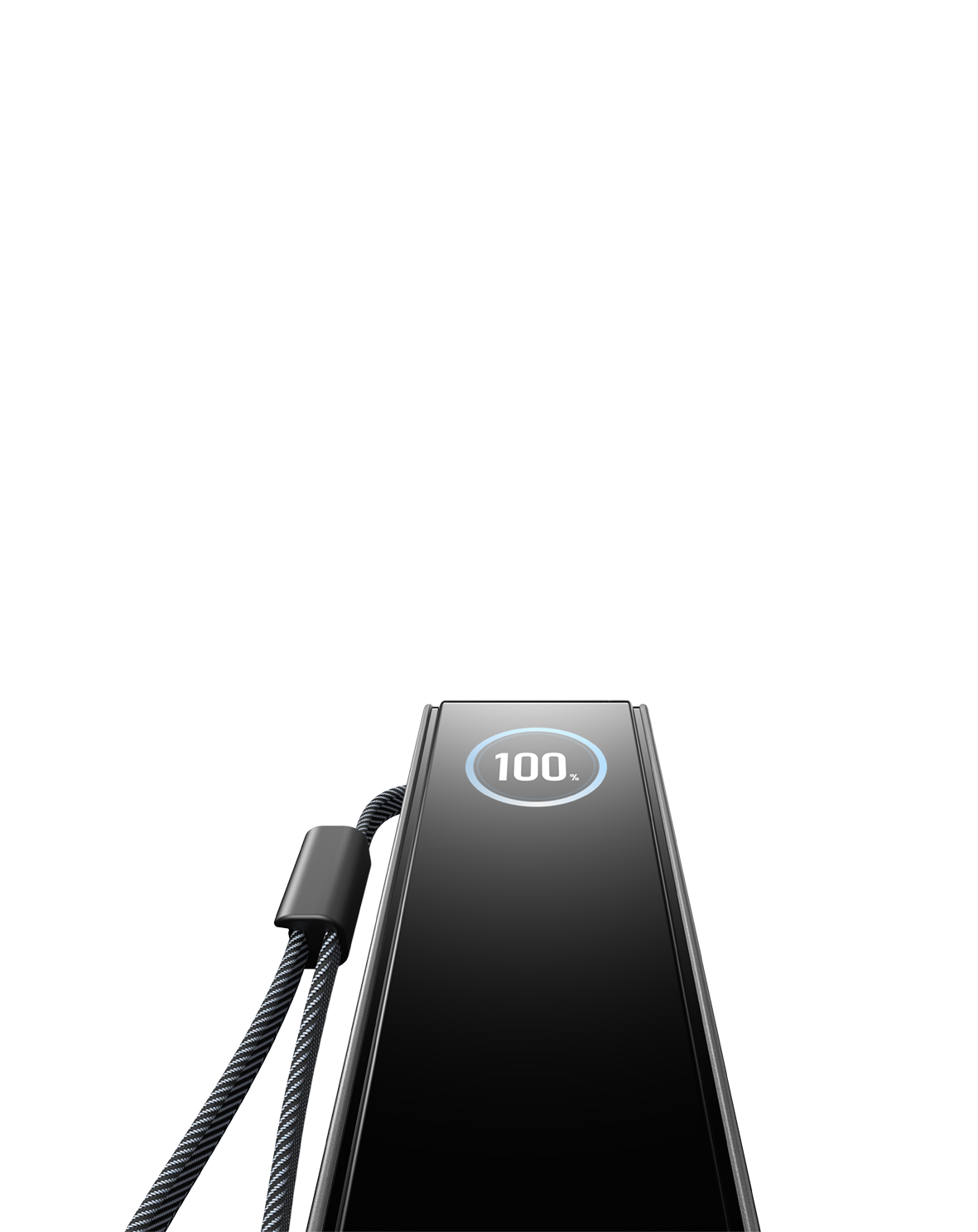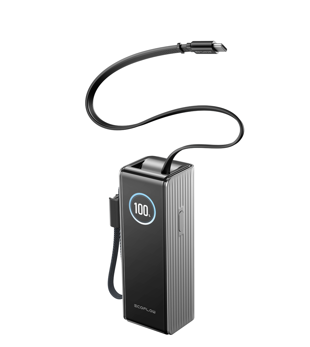 Powerbank für mehrere Geräte: 2x USB-C-Anschluss, 1x ausziehbares USB-C-Kabel (67 cm), 1x Trageband mit integriertem Type-C-Kabel (26 cm)