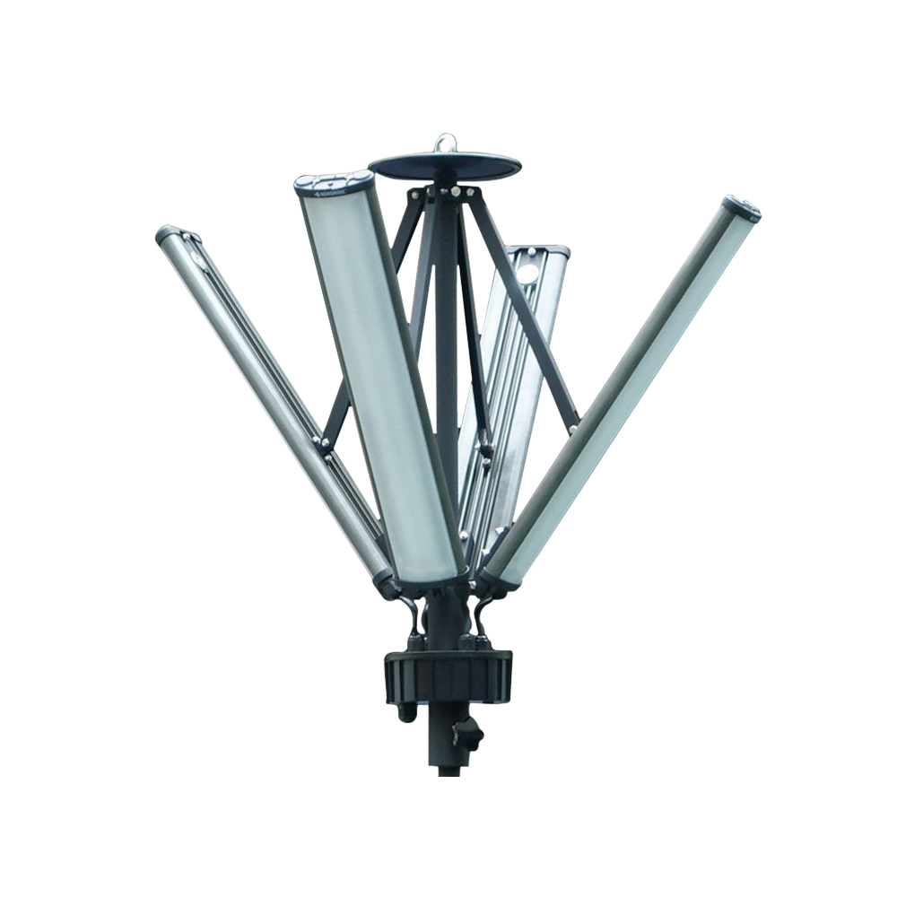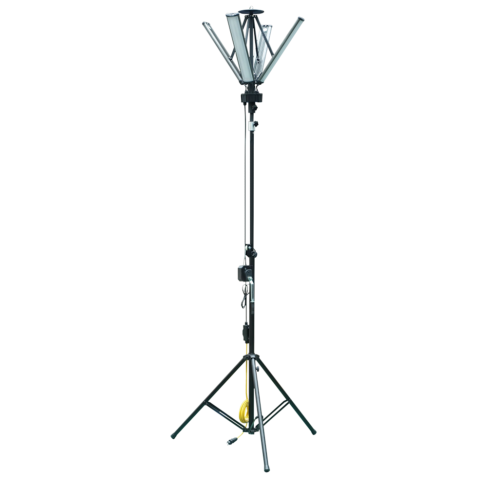 Flexible 360°-Beleuchtung, optimale Lichtwirkung dank verstellbarem Leuchtwinkel, Leuchtstark mit 2 Leuchtstufen (12’000 u. 24’000 lm), angenehmes leicht diffuses Arbeitslicht (5’000 K), gute Farbwiedergabe (CRI/Ra > 80), robustes Design, staubdicht und wassergeschützt (IP65), kurze Auf- und Abbauzeiten, einfache Handhabung und Bedienung, Bedienkonsole mit Magneten zur flexiblen Befestigung, platzsparender Transport, H07RN-F-Kabel (10 m), IP54, CH-T12-Stecker, bei Montage auf zusätzlich erhältliches Stativ (Artikel 1044) auf 3 m Höhe verstellbar. Montage hängend mit im Lieferumfang enthaltener Öse, inklusive Tragtasche