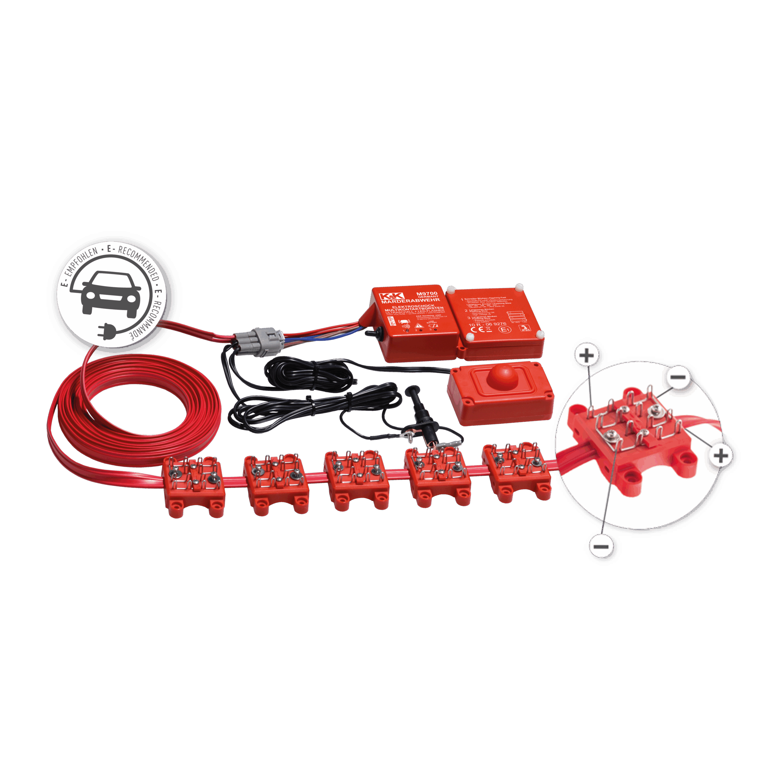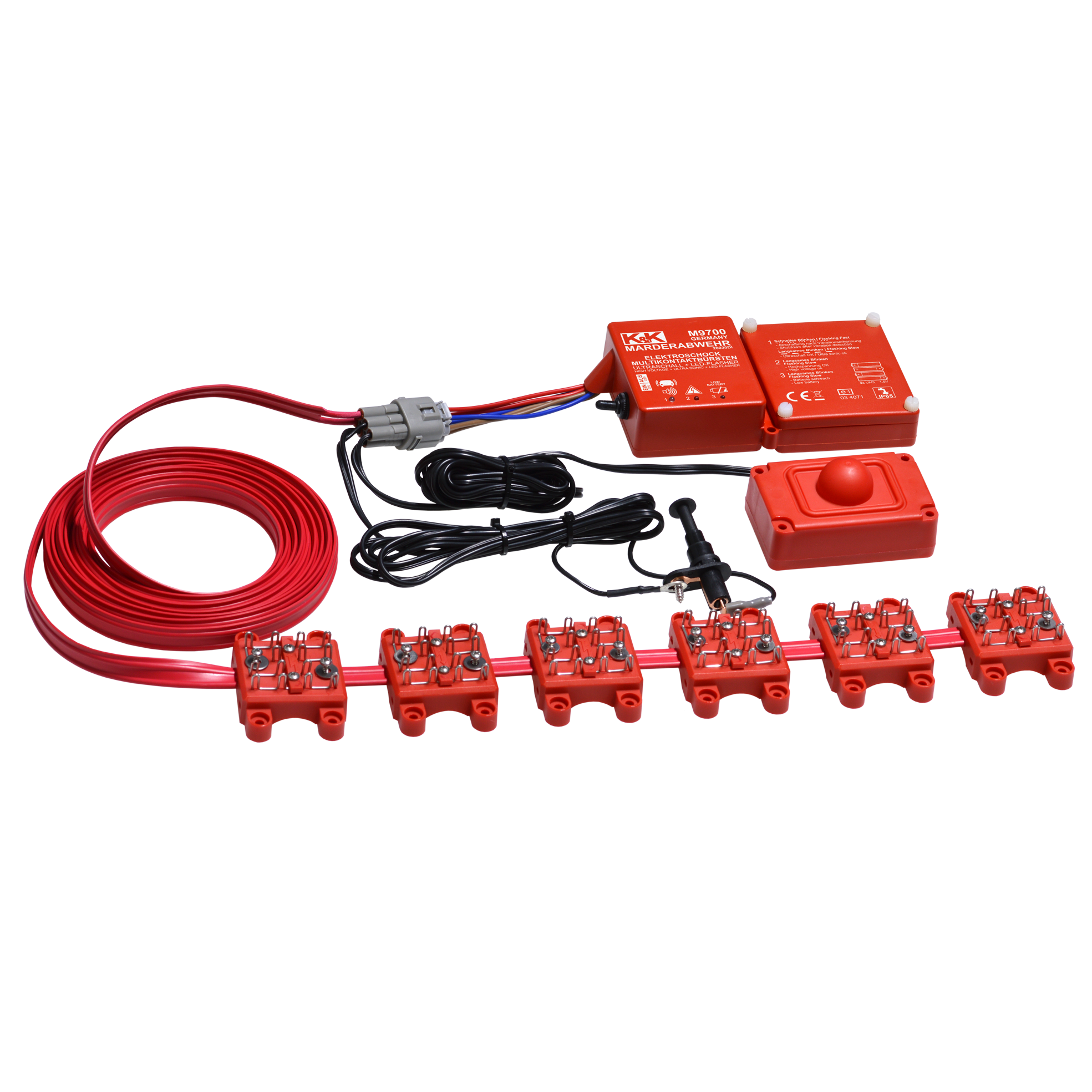 Eine Low-Battery-Anzeige mit LED warnt schon frühzeitig, sollten die Batterien im Gerät einmal leer sein. Dank der 6 Multikontakt-Hochspannungsbürsten wird den bissigen Angreifern ein Stromschlag versetzt, der die Tiere verjagt, aber nicht verletzt oder tötet. Dabei ist es egal, ob der Marder die Kontaktflächen mit einer sensiblen Körperstelle (Pfoten, Schnauze) berührt oder nicht. Die Multi-Kontakt-Hochspannungsbürsten wirken durch das dichte und sonst isolierende Fell hindurch. Besonders dicht sind auch unsere Kuppellautsprecher – nämlich wasserdicht! Dadurch können sie besonders tief im Motorraum angebracht werden und so verhindern, dass der Marder auch nur eine Pfote in den Motorraum setzt. Der pulsierende Sinus-Ultraschall ist der zweite Baustein in der autarken Marderabwehr des M9700, der dank des tiefen Einbaus nach unten hin Sicherheit bietet.