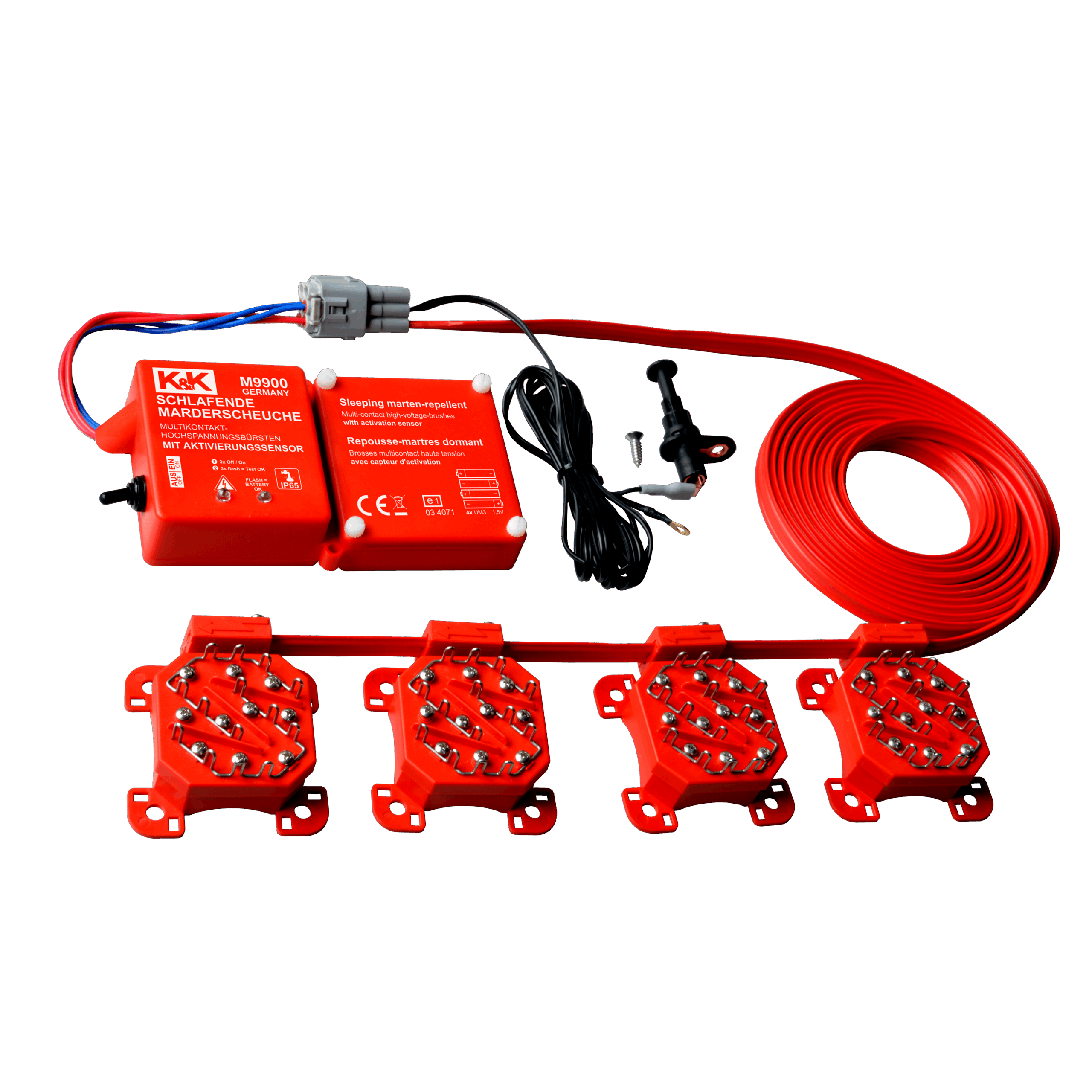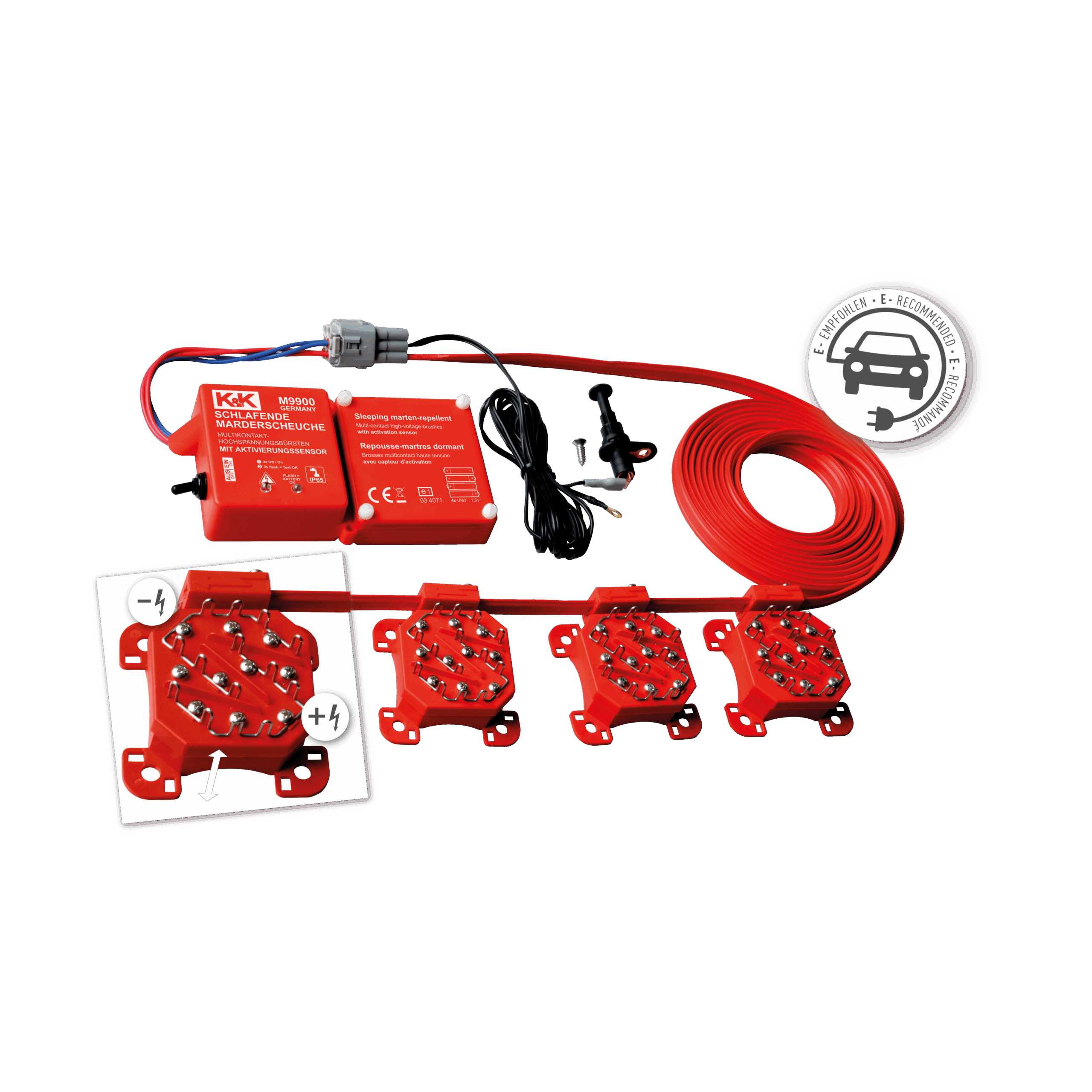 Hochspannungsabwehr ist gerade bei besonders aggressiven Tieren im Revierkampf und „Veteranen“ mit veränderter Hörschwelle unumgänglich. Als besonders effektiv haben sich hierbei die felldurchdringenden K&K +/- Hochspannungsbürsten bewährt, weshalb sie auch beim M9900 in 4-facher Ausführung zum Einsatz kommen. Im Gegensatz zu herkömmlichen Kontaktplatten kämmen die Edelstahlbürsten durch das Fell und so bieten nicht nur Pfote und Schnauze eine Angriffsfläche, sondern der gesamte Körper des Eindringlings. Aufgrund der wasserdicht vergossenen Elektronik, kann das Gerät besonders tief im Motorraum angebracht werden und agiert somit als „Türsteher“ für den besonders schutzwürdigen Eintrittsbereich des Marders. Die flexibel verschiebsowie erweiterbaren Edelstahlbürsten ermöglichen zudem eine optimale Anpassung an den jeweiligen Motorraum. Wird die Motorhaube geöffnet führt der Sicherheits-Motorhaubenschalter zu einem sofortigen Abbau der Hochspannung an den Kontaktplatten und ermöglicht somit ein gefahrloses Arbeiten. Selbstverständlich erfüllt auch diese Innovation die strengen OEM Anforderungen.
