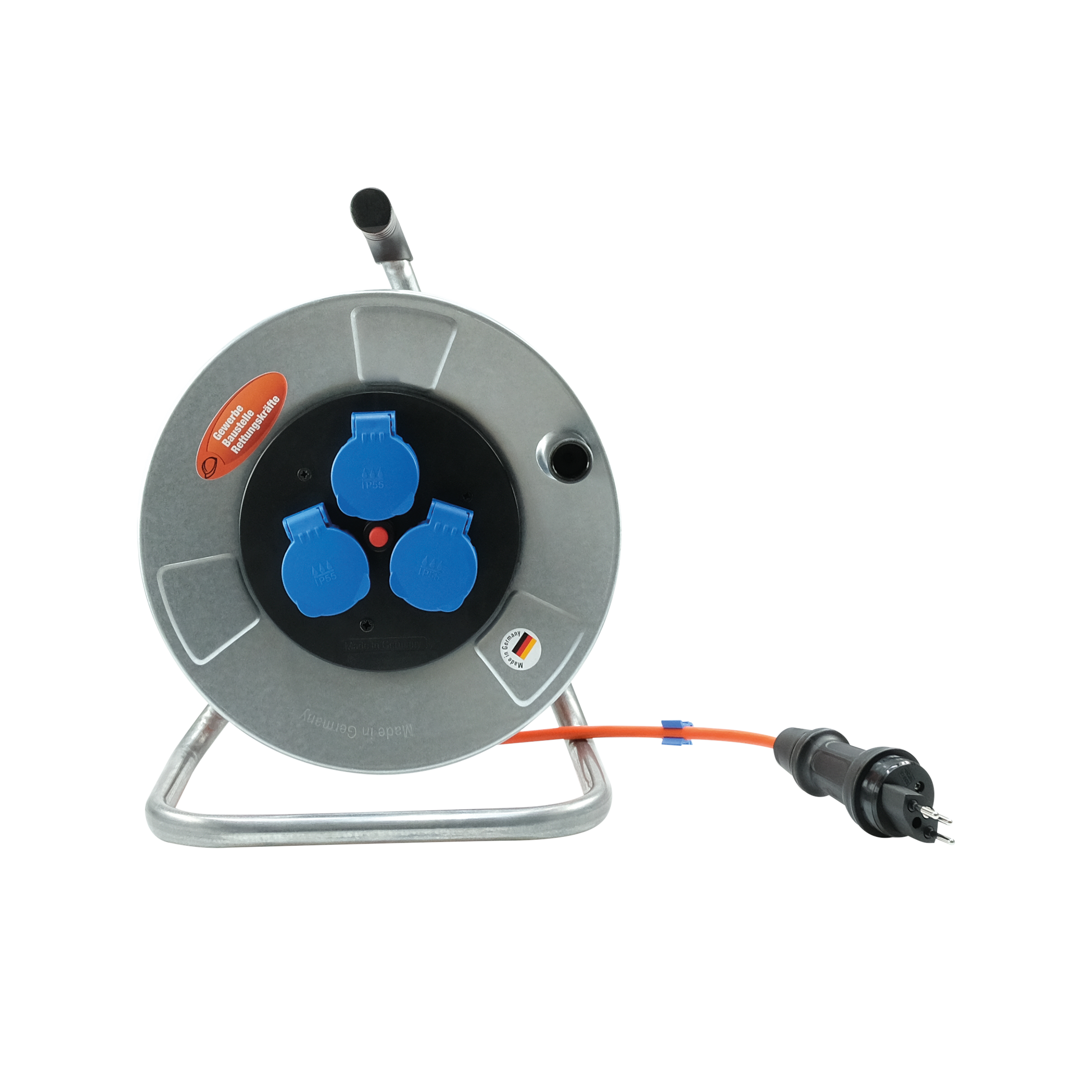 - 230 VAC Kabelrolle aus Metall - Kabellänge 33 m CH-N1BQ-F3G1.5 - PUR-PUR mit Stecker T12 (IP55) - 3 Steckdosen...