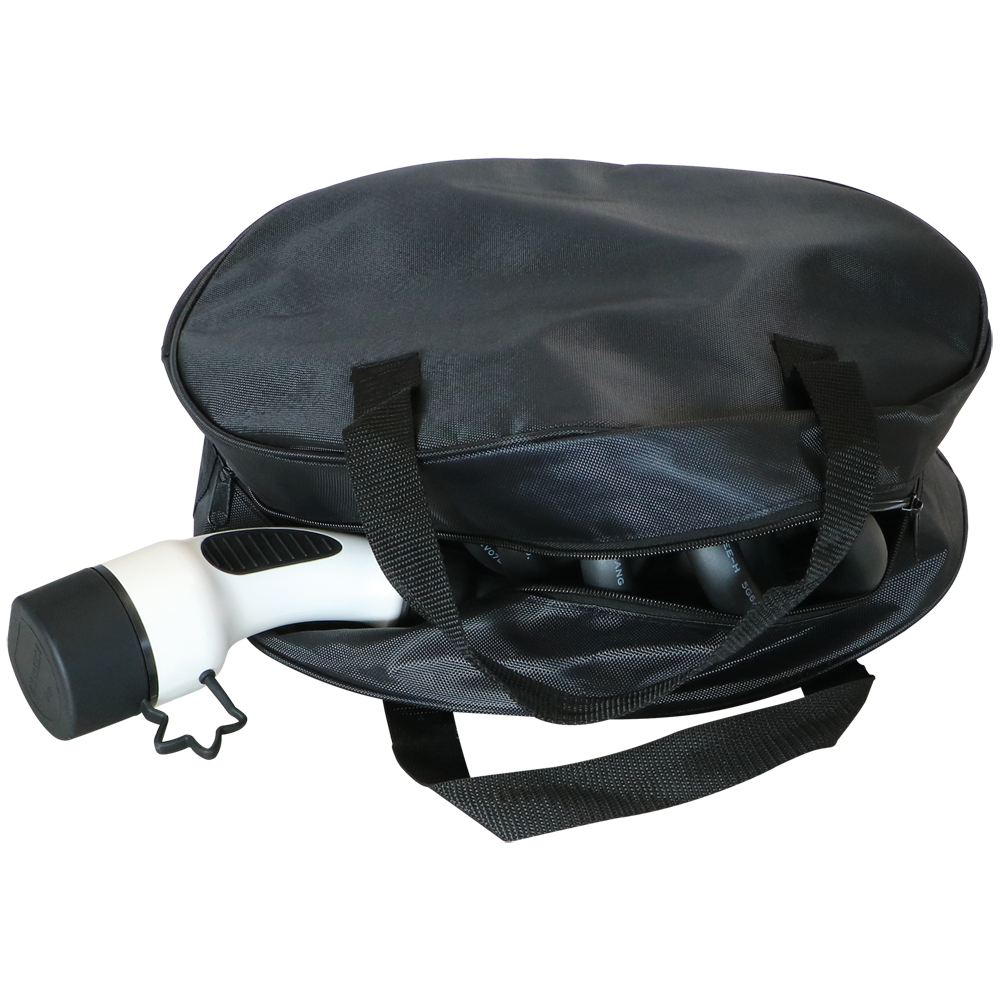 Schwarze Tragetasche mit Reissverschluss zur Lagerung des Ladekabels.