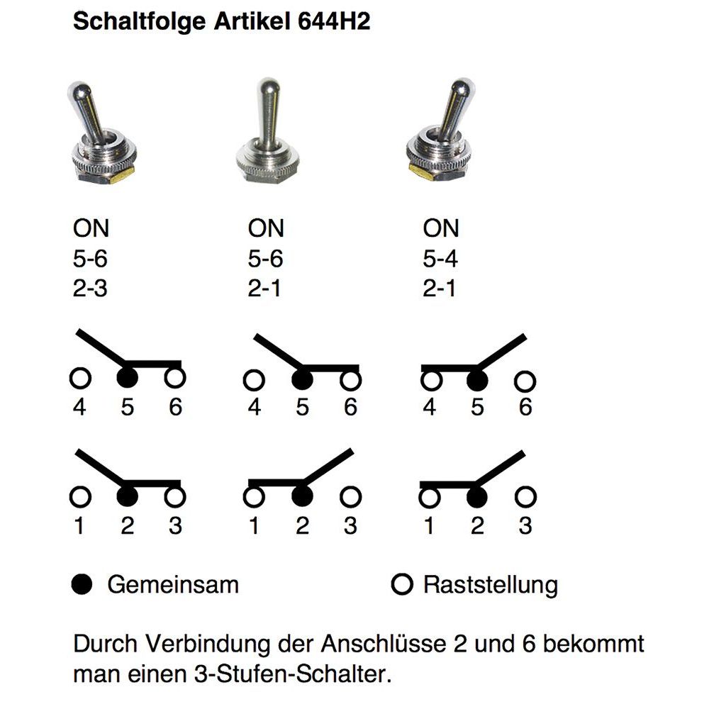 * durch Verbinden der Anschlüsse 2 und 6 bekommt man einen 3-Stufen Schalter * Anschluss 5 = Eingang, Pos.1 = Anschl.3 aktiv, Pos.2 = Anschl.1 aktiv, Pos. 3 = Anschl.4 aktiv *
