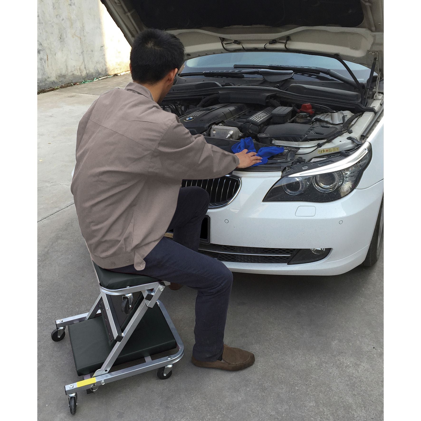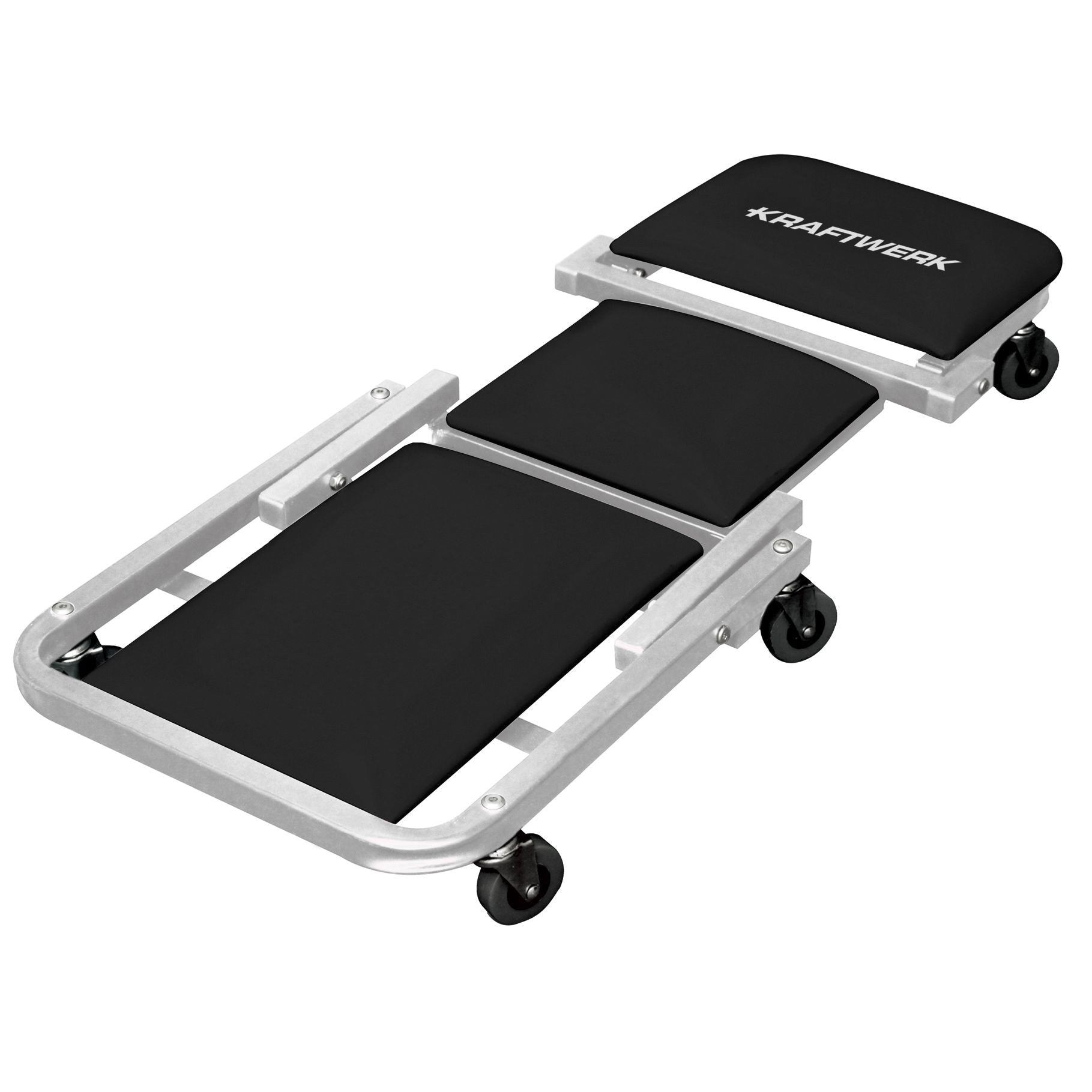 Anwendungsbereich: Automotive Werkstattliege und -klappsitz Mit 6 Lenkrollen und Multifunktional als Liegepritsche oder als Werkstatthocker nutzbar Max. 150 kg belastbar