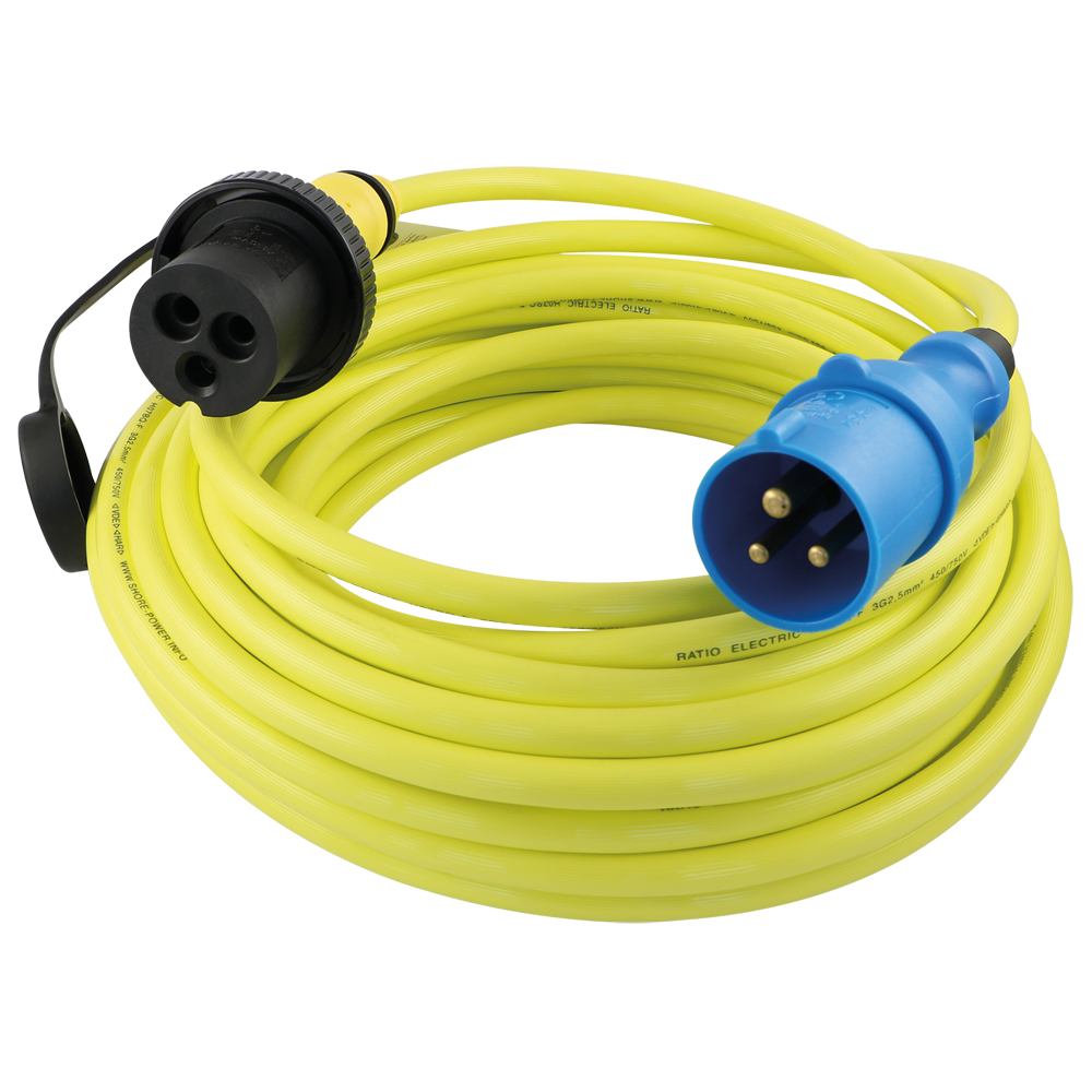 Fertig konfektioniertes Kabel mit angespritztem CEE-Stecker und Kupplungsdose MPS16/10 mit Schutzkappe passend für MP16/10. Hochwertige gelbe wetterfeste PUR-Leitung H07BQ-F. Im...