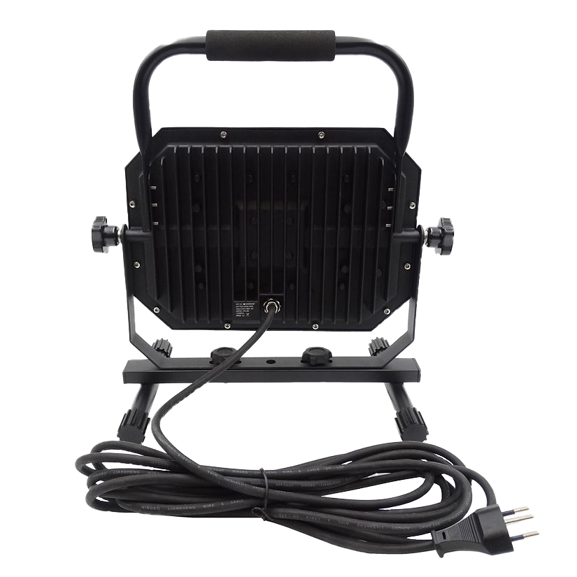 LED-Baustrahler mit auf robustem Ständer; dank seitlicher Entblendung (prismatischer Diffusor) hat der Strahler eine gleichmässige Ausleuchtung und dies in angenehmen...