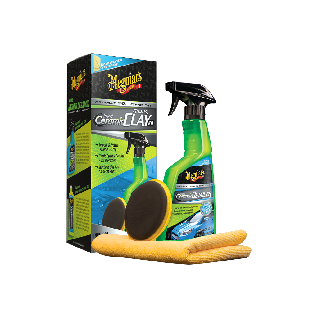 Das neue Meguiar’s Hybrid Ceramic Clay Kit kombiniert in einem einfachen Schritt die glättenden Eigenschaften einer Lackreinigungsknete mit dem extremen Abperlverhalten und Lackschutz der Meguiar’s Hybrid Ceramic Technologie. Das spezielle synthetische Knetpad glättet die Oberfläche und entfernt tiefsitzende Verunreinigungen. Der Hybrid Ceramic Detailer fungiert für das Knetpad als Gleitfilm und erzeugt gleichzeitig einen zusätzliche Lackschutz.Das Ergebnis ist eine Lackoberfläche, die glatt und glänzend ist und mit einem extremen Abperlverhalten begeistert.