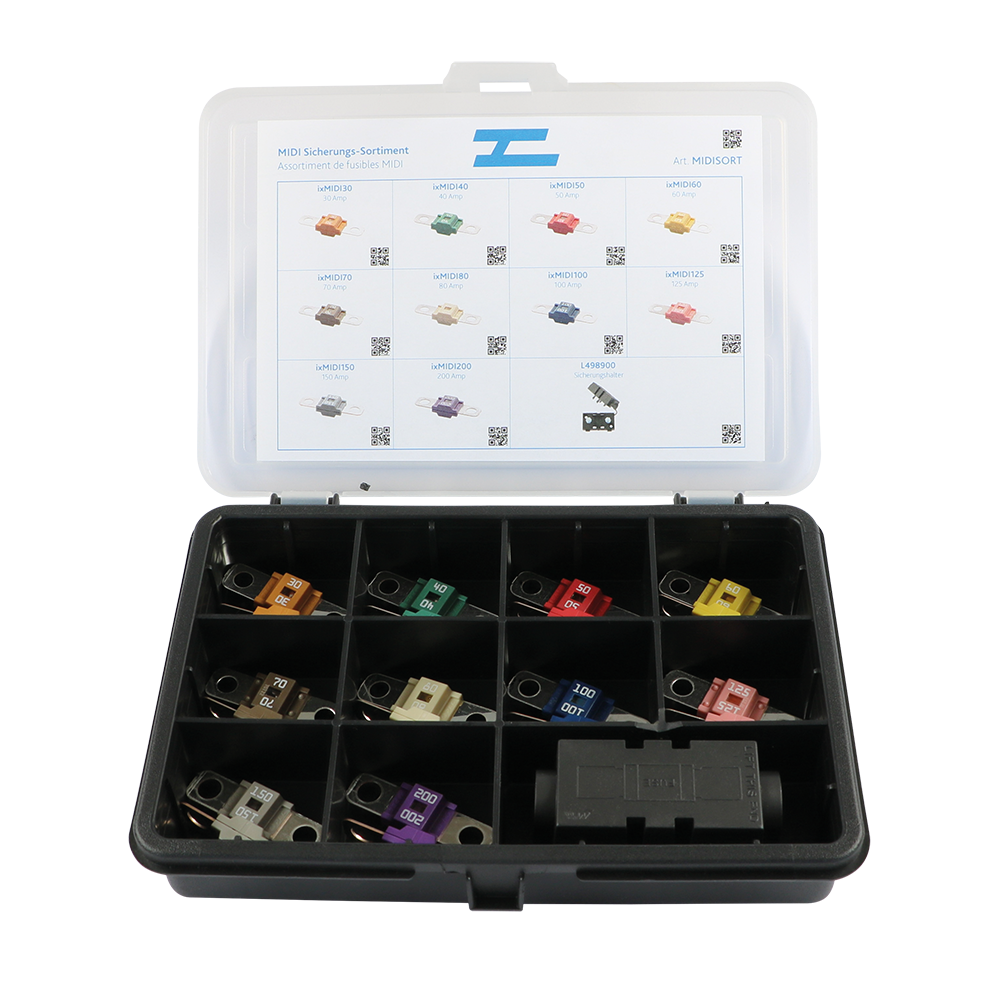 Inhalt: - je 2 x 30A, 40A, 50A, 60A, 70A, 80A, 100A, 125A, 150A, 200A MIDI-Sicherungen - 1x Sicherungshalter L498900Abmessungen180...