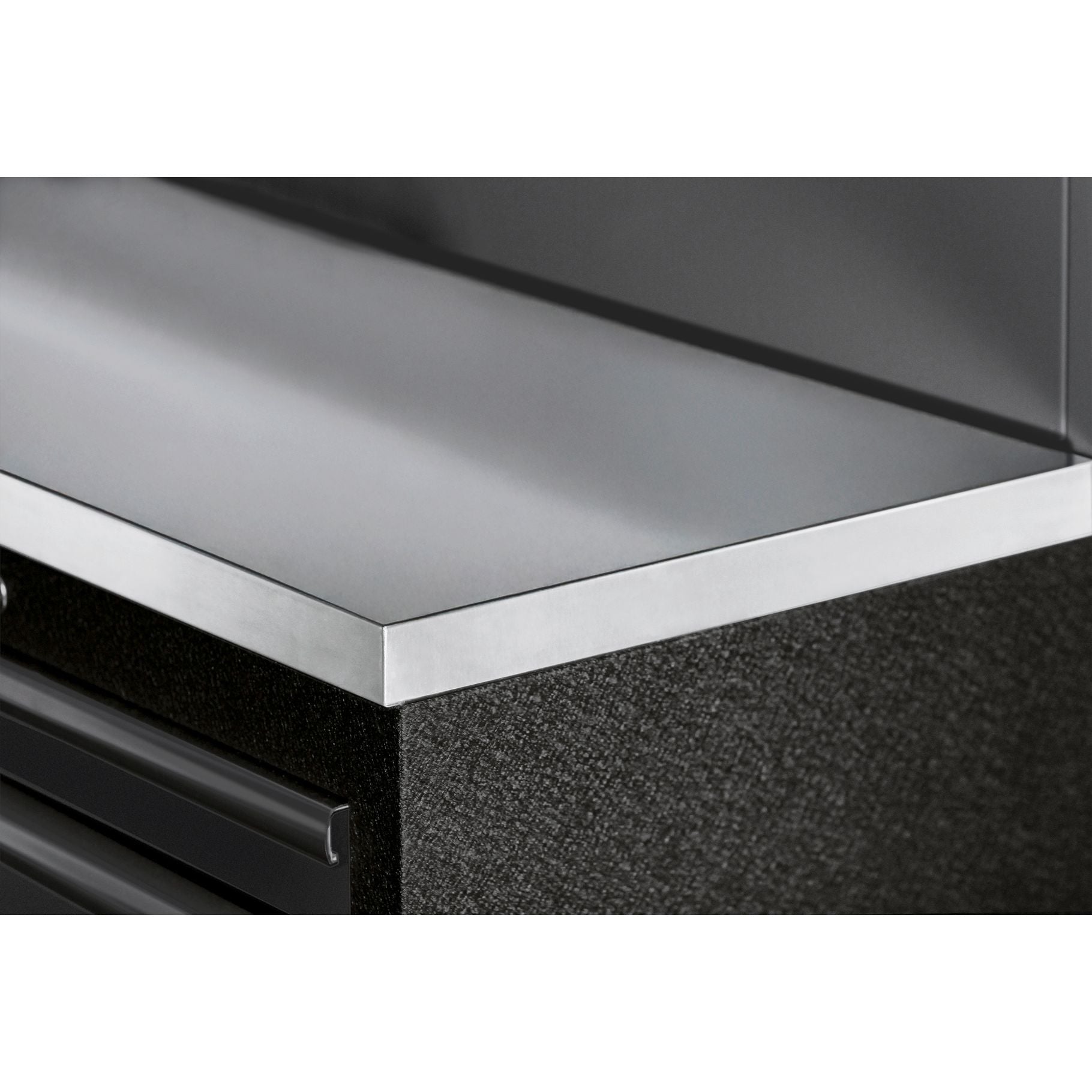 Die Arbeitsplatte aus 38 mm starkem Edelstahl 430 in Kombination mit den schwarzen Schränken ist nicht nur ein Blickfang, sondern bietet auch eine besonders robuste und langlebige Arbeitsfläche. Auf dieser stabilen Oberfläche können Sie selbst schwere und anspruchsvolle Arbeiten problemlos ausführen.