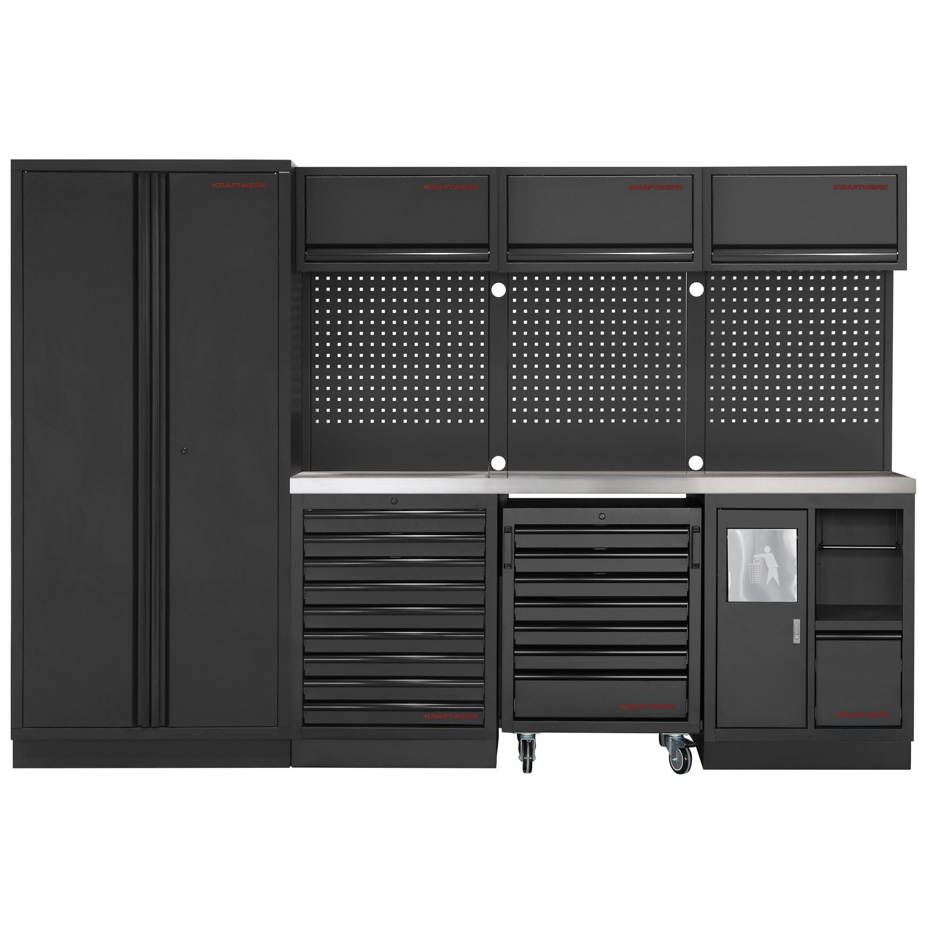 Die KRAFTWERK MOBILIO BLACK EDITION 4er Kombi bietet Dir die ideale Lösung für Deine Werkstattorganisation. Diese vielseitige Kombination aus hochwertigen Modulen ist perfekt aufeinander abgestimmt und lässt sich nach Deinen individuellen Bedürfnissen zusammenstellen. Ob für Profi- oder Hobbywerkstatt – die freistehende Konstruktion macht eine einfache, flexible Platzierung ohne Befestigung möglich. Mit den kompakten Maßen H 2000 x B 2955 x T 488 mm für optimale Raumnutzung.
