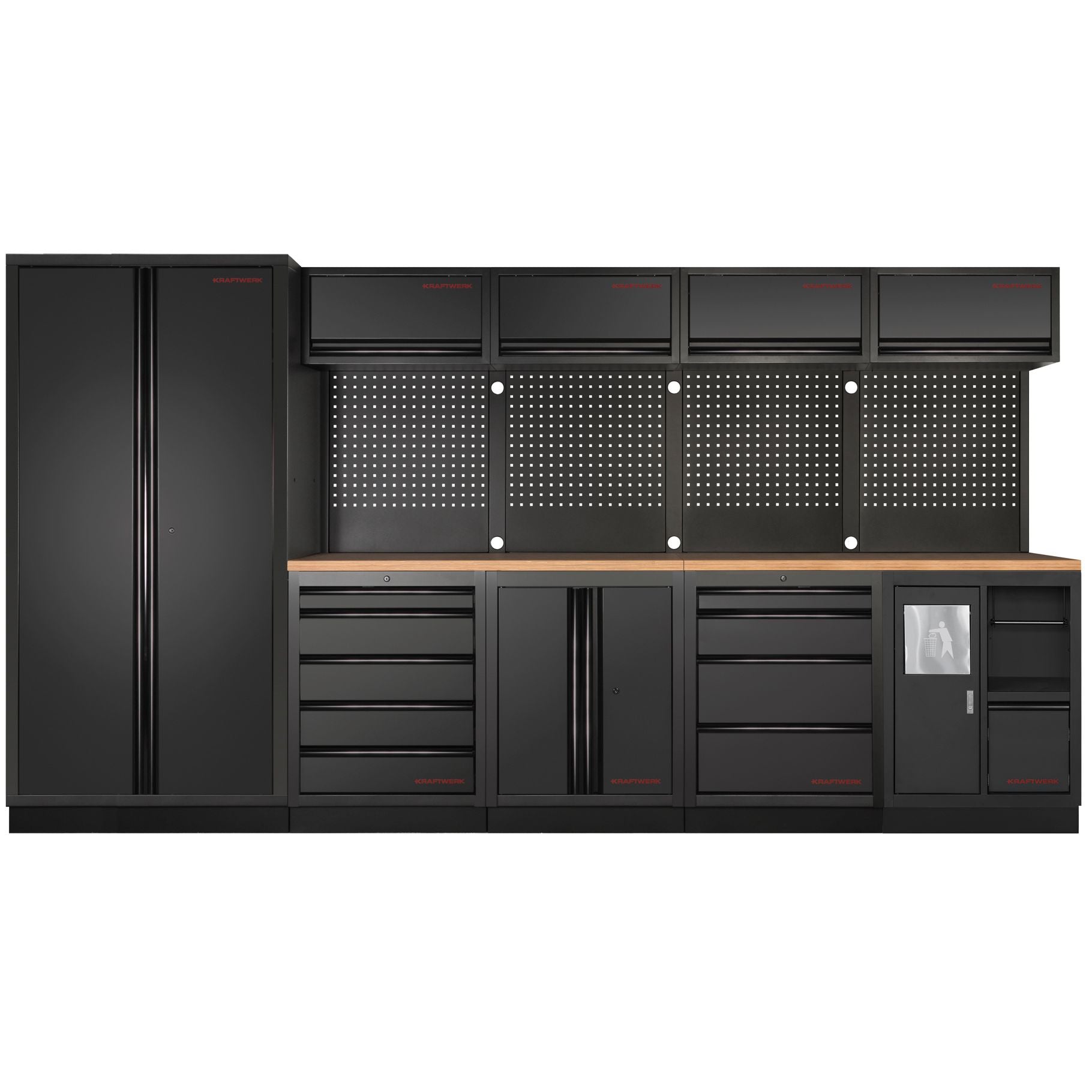 Die KRAFTWERK MOBILIO BLACK EDITION 5er Kombi ist die perfekte Lösung, wenn du in deiner Werkstatt auf Ordnung und Effizienz setzt. Mit neun Schubladen, sechs Schränken, einem integrierten Papierrollenhalter und einer robusten Vierkant-Lochwand, alles in modernem Schwarz gehalten, bietet dieses modulare System alles, was du für die professionelle Aufbewahrung deiner Werkzeuge und Materialien benötigst.