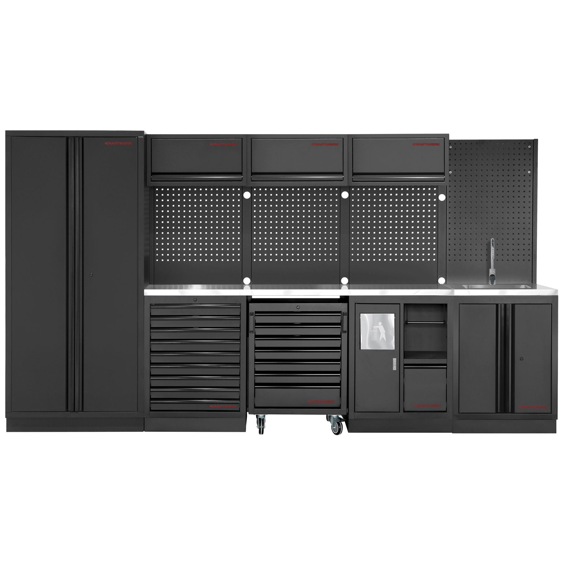 Mit der KRAFTWERK MOBILIO SANITORY BLACK EDITION 4er Kombi holst Du Dir eine vielseitige und funktionale Lösung für Deine Werkstatt. Die Kombination aus robusten Schränken, Schubladen und einer hochwertigen Edelstahl-Arbeitsplatte bietet Dir genau das, was Du für effizientes Arbeiten brauchst. Dabei lässt sich jedes Modul nach Deinem Bedarf zusammenstellen – für maximale Flexibilität.