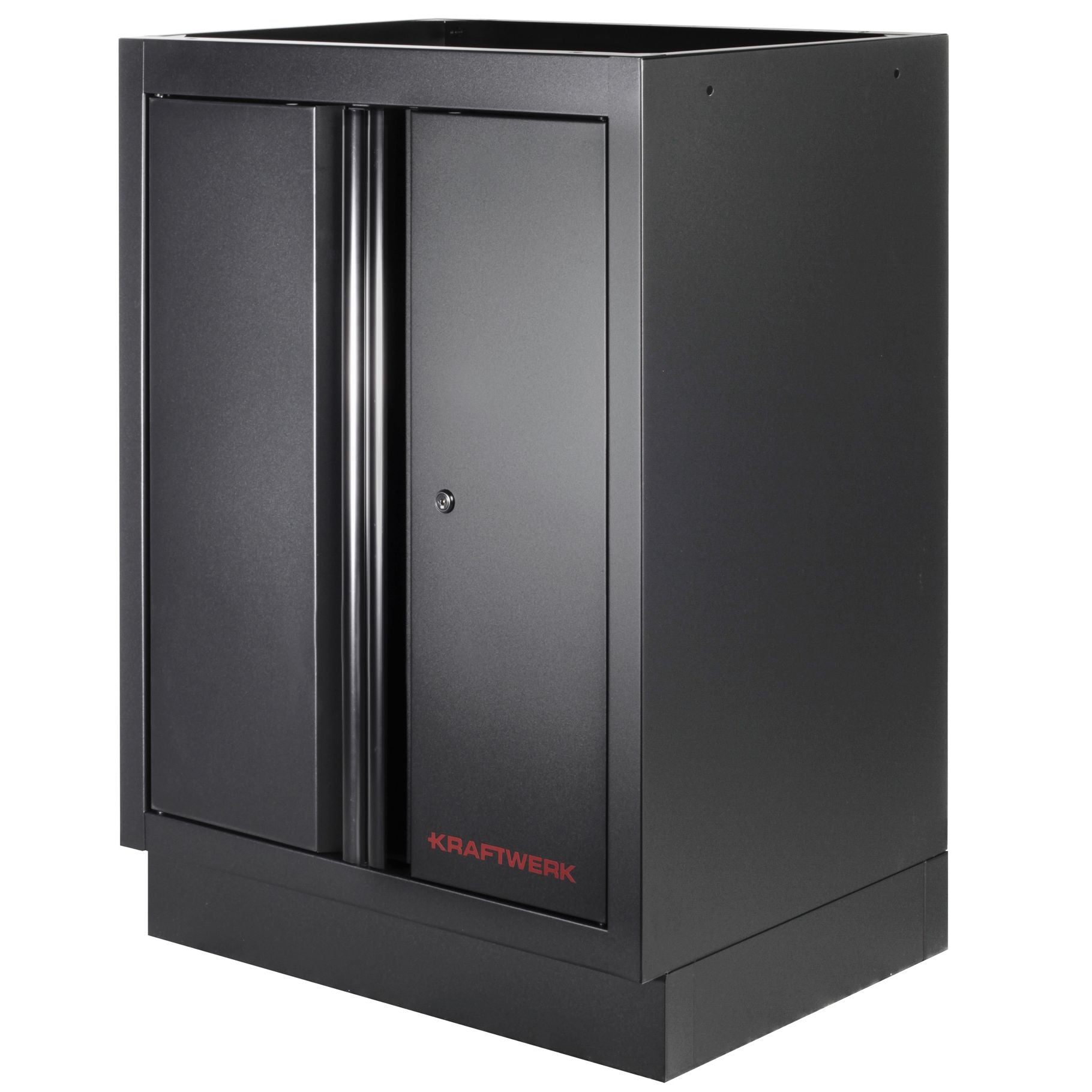 Der KRAFTWERK MOBILIO BLACK EDITION Unterschrank, 2-türig ist die ideale Lösung für Werkstätten, die eine stabile Basis für ihre Werkbank und zusätzlichen Stauraum benötigen. Mit seiner praktischen Zentralverriegelung, der Möglichkeit zur Kombination mit einer Arbeitsplatte und der Kompatibilität mit Vierkant-Lochwänden ist er ein unverzichtbares Element für jede gut organisierte Werkstatt.