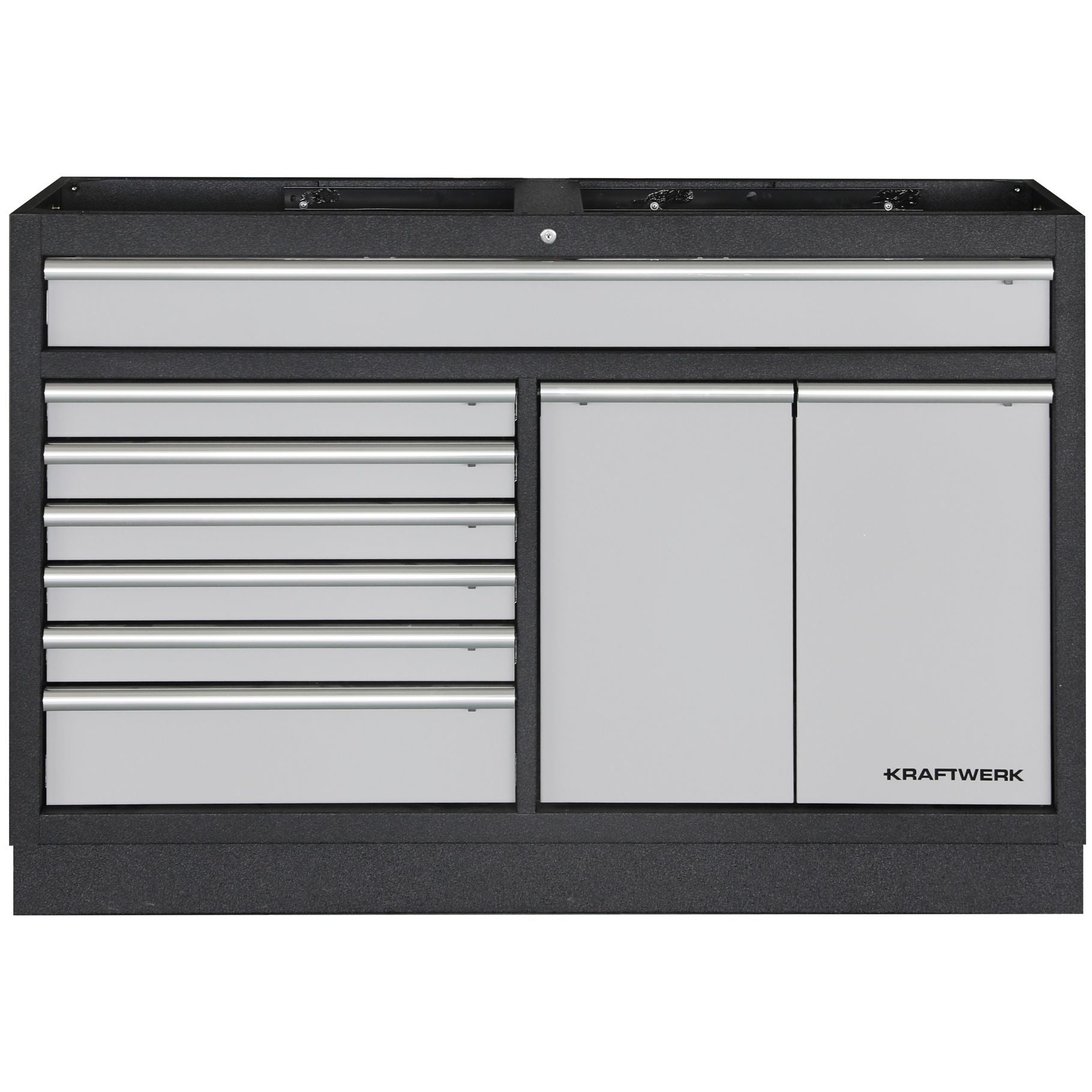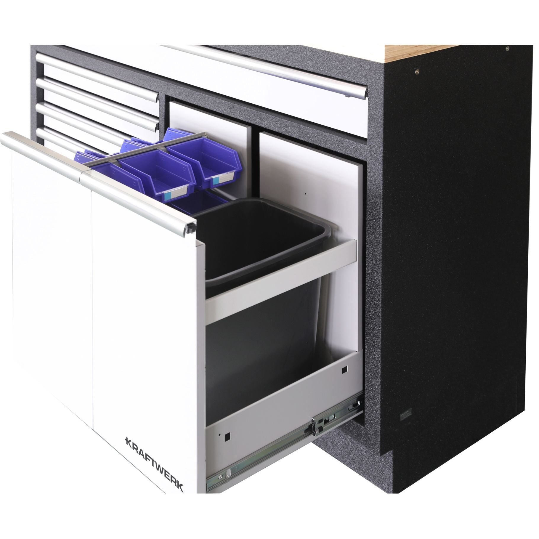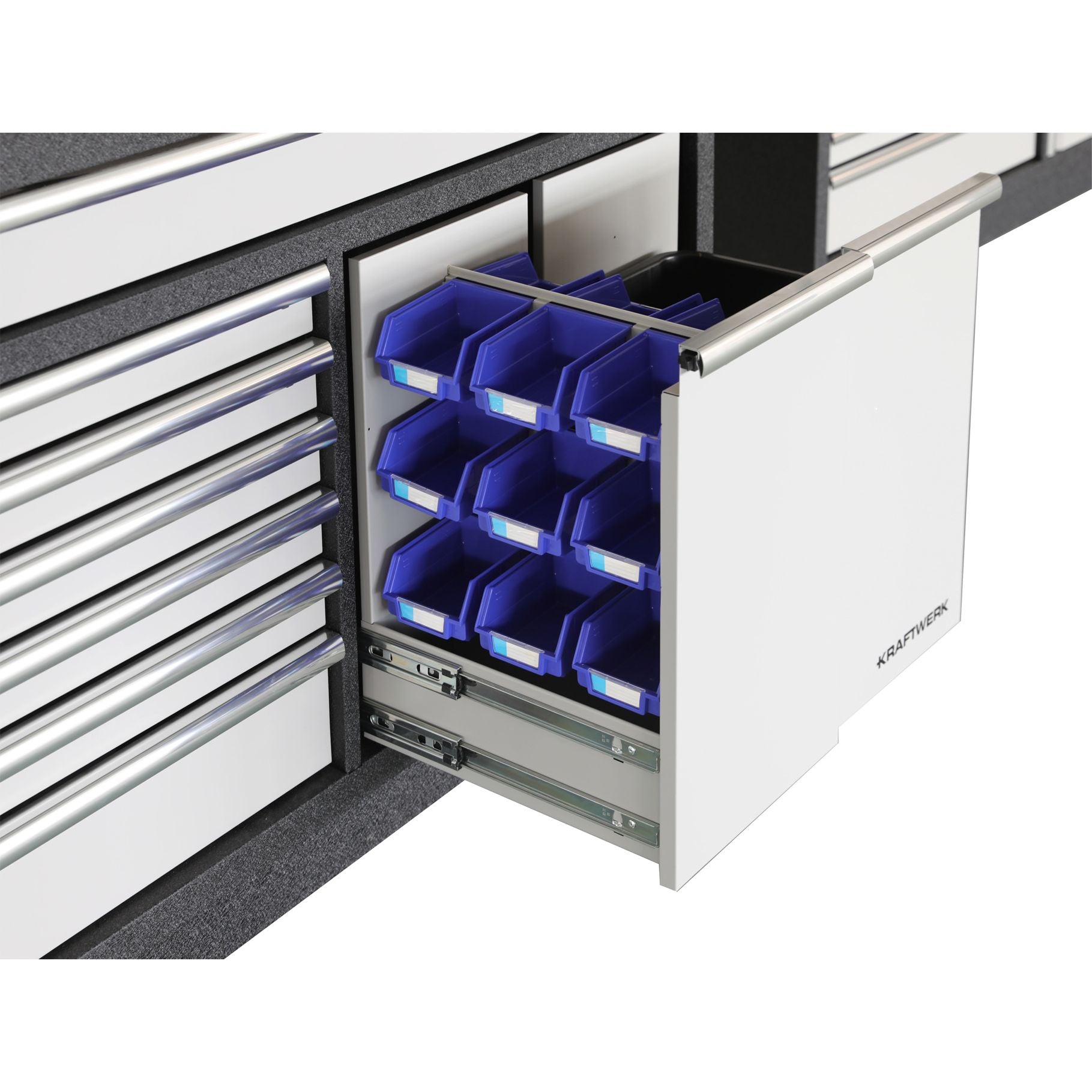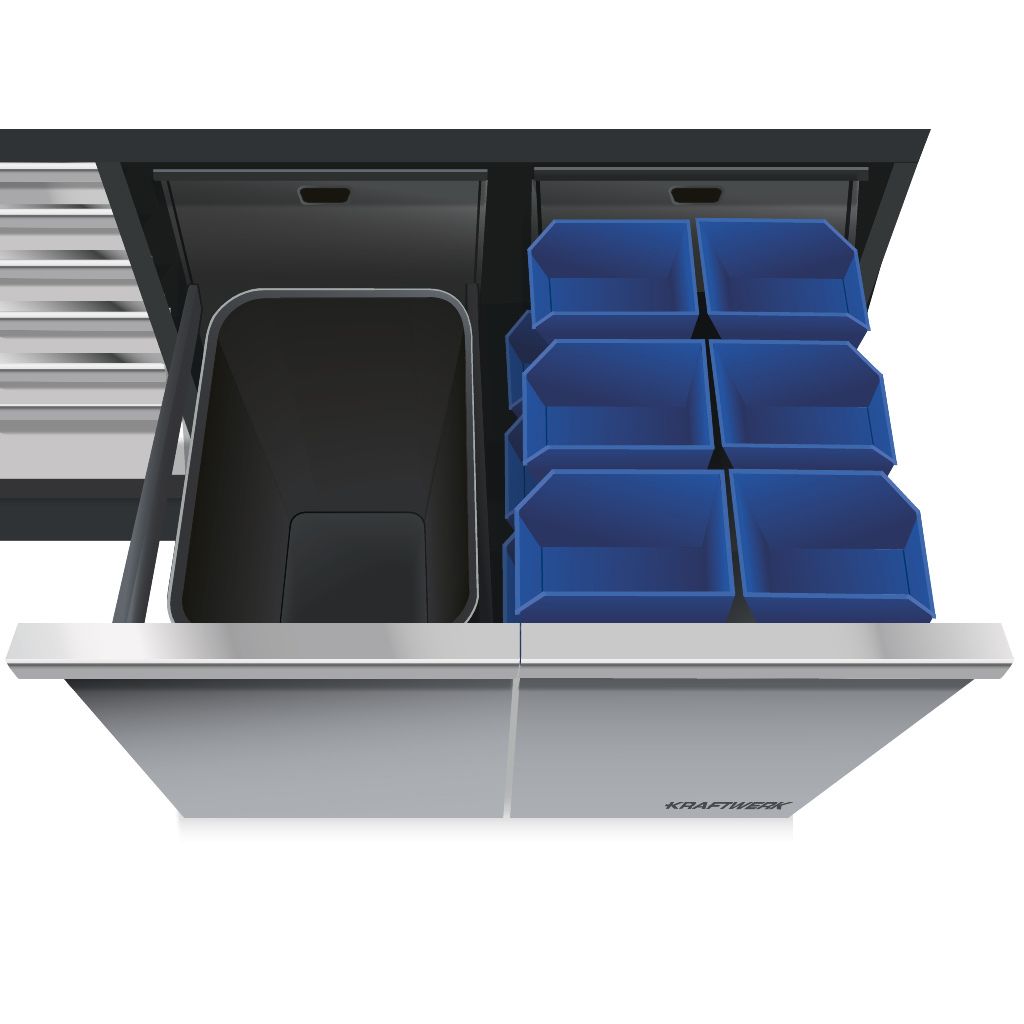 Der Werkstattschrank bietet vielfältige Möglichkeiten zur Aufbewahrung von Werkzeugen und Kleinteilen. Kugelgelagerte Schubladenführungen ermöglichen ein komplettes und müheloses Öffnen und Schliessen der Schubladen. Ein hochwertiges Schloss mit zwei Schlüsseln gewährleistet die Sicherheit Ihrer Werkzeuge. 12 Kunststoffschalen bieten zusätzlichen Stauraum für Kleinteile. Ein Mülleimer im Inneren der Schublade sorgt für Ordnung und Sauberkeit. Das Gehäuse wird vormontiert geliefert. Die Arbeitsplatte ist wahlweise aus Buche-Multiplex oder Edelstahl 430 erhältlich.