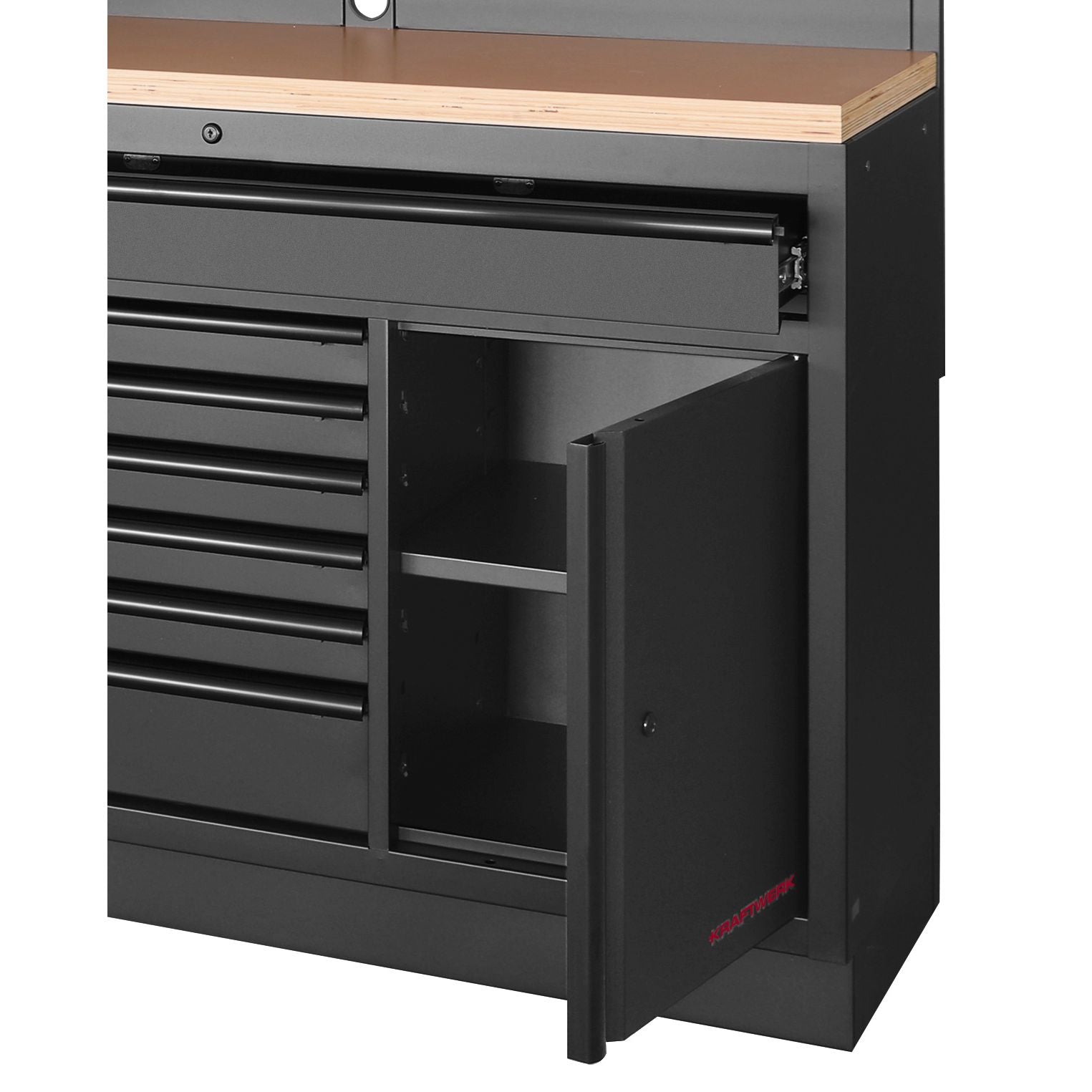 Ob in der Garage, der Hobbywerkstatt oder im professionellen Bereich – der KRAFTWERK MOBILIO BLACK EDITION Unterschrank überzeugt durch seine robuste Verarbeitung und seine Vielseitigkeit. Die durchdachte Kombination aus Schubladen und Schranktür macht ihn zu einem unverzichtbaren Bestandteil jeder Werkstatt.