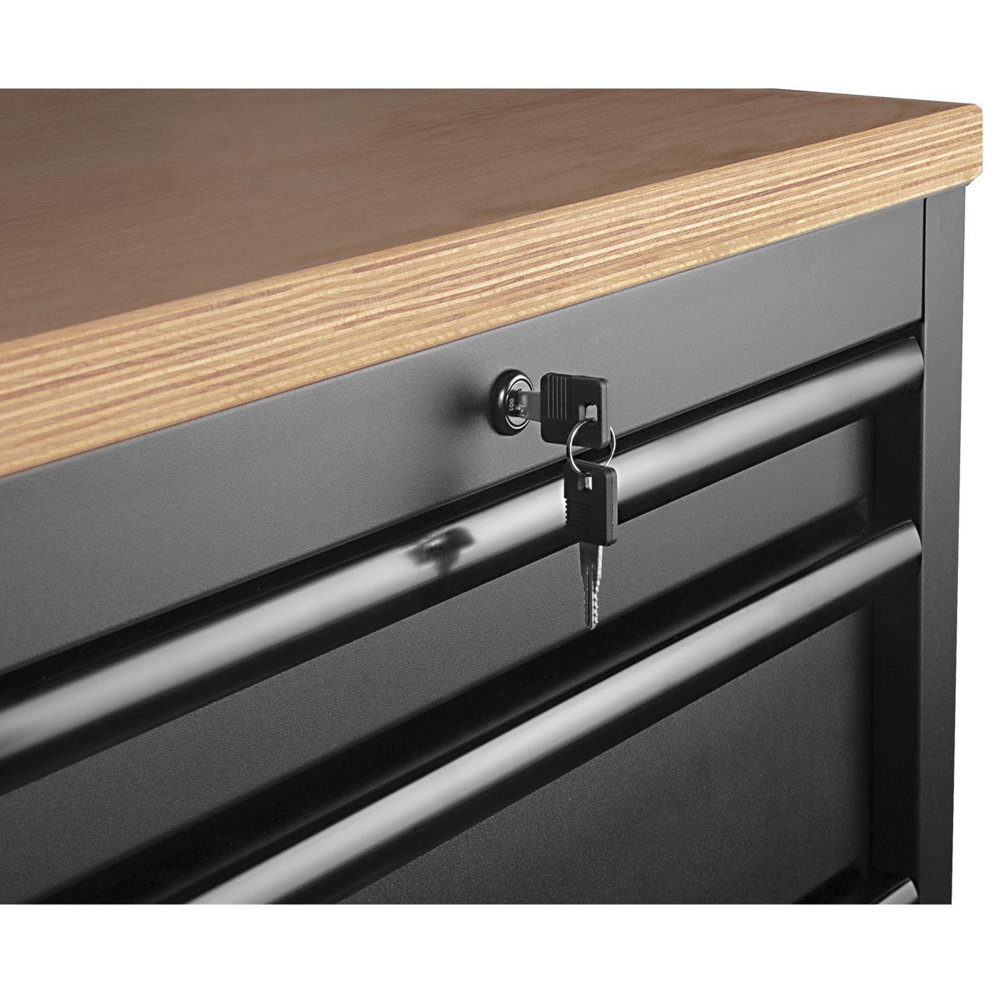Der Unterschrank verfügt über vier unterschiedlich große Schubladen, die dir vielseitigen Stauraum für Werkzeuge und Arbeitsmaterialien bieten. Jede Schublade ist kugelgelagert und lässt sich dank des Vollauszugs komplett öffnen. Dies ermöglicht dir den einfachen Zugriff auf das gesamte Schubladeninnere, sodass du auch tief gelagerte Gegenstände mühelos erreichst. Die Schubladen sind in unterschiedlichen Höhen (58 mm, 138 mm, 207 mm) aufgeteilt, sodass du Werkzeuge, Ersatzteile und andere Materialien optimal sortieren kannst.