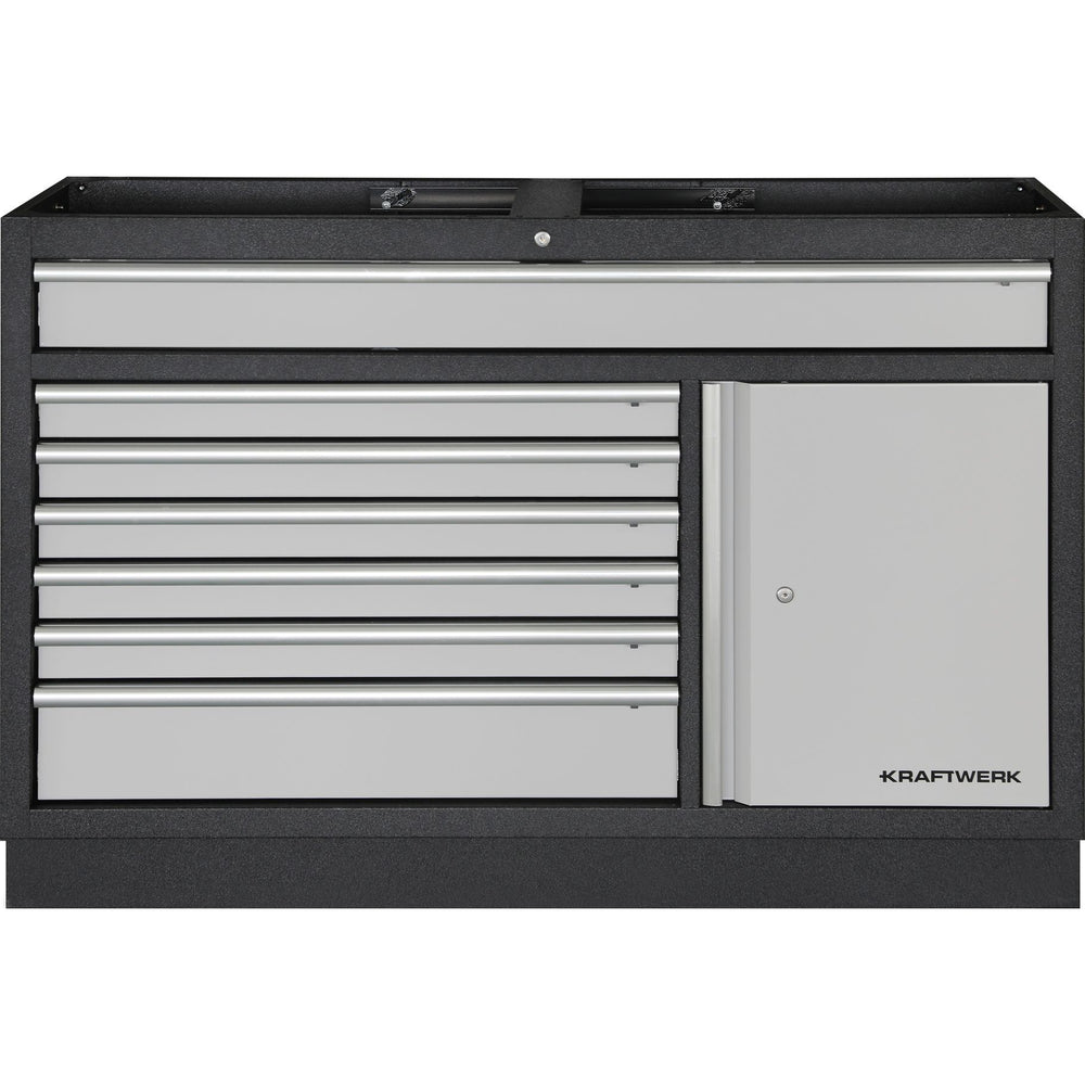 Vielseitiger Schrank für Ihre Garage oder Werkstatt. Der Werkstattschrank überzeugt mit seiner Flexibilität und Funktionalität. Kugelgelagerte Schubladenführungen ermöglichen ein komplettes und müheloses Öffnen und Schliessen der Schubladen. Ein verstellbarer Einlegeboden in der Tür bietet zusätzlichen Stauraum. Ein hochwertiges Schloss mit zwei Schlüsseln gewährleistet die Sicherheit Ihrer Werkzeuge. Das Gehäuse wird vormontiert geliefert. Die Arbeitsplatte ist wahlweise aus Buche-Multiplex oder Edelstahl 430 erhältlich.