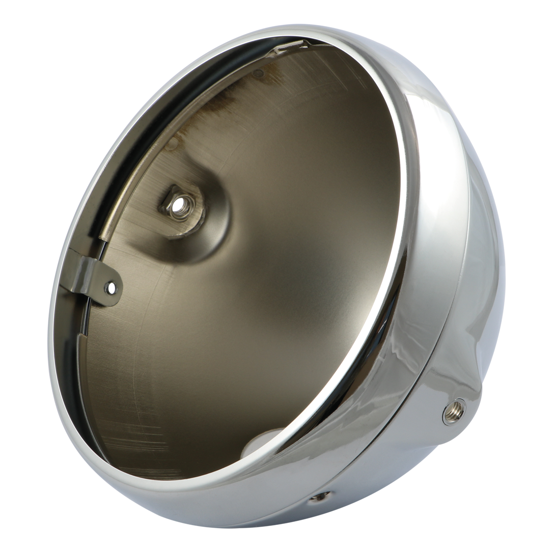 Motorrad-Scheinwerfergehäuse für 7“ LED-Hauptscheinwefer Gehäuse und Frontrahmen aus Stahl Ausführung in chromReferenznummer-Spannung-Abmessungenø: 180mm, Tiefe: 130mm, Lochabstand: 190mm (2x M8)
