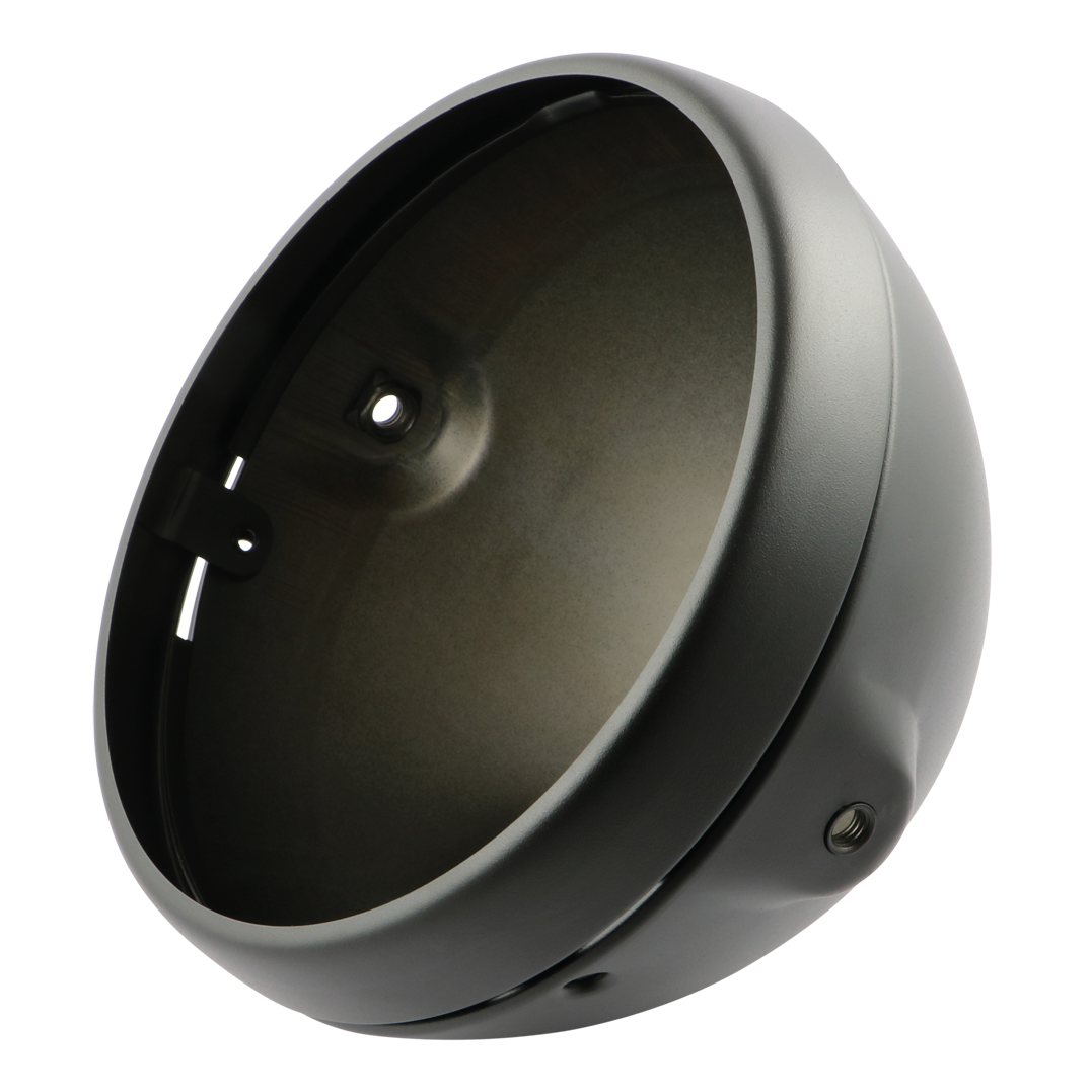 Motorrad-Scheinwerfergehäuse für 7“ LED-Hauptscheinwefer. Gehäuse und Frontrahmen aus Stahl. Ausführung in Mattschwarz.Referenznummer-Spannung-Abmessungenø: 180 mm, Tiefe: 130 mm, Lochabstand: 190 mm...