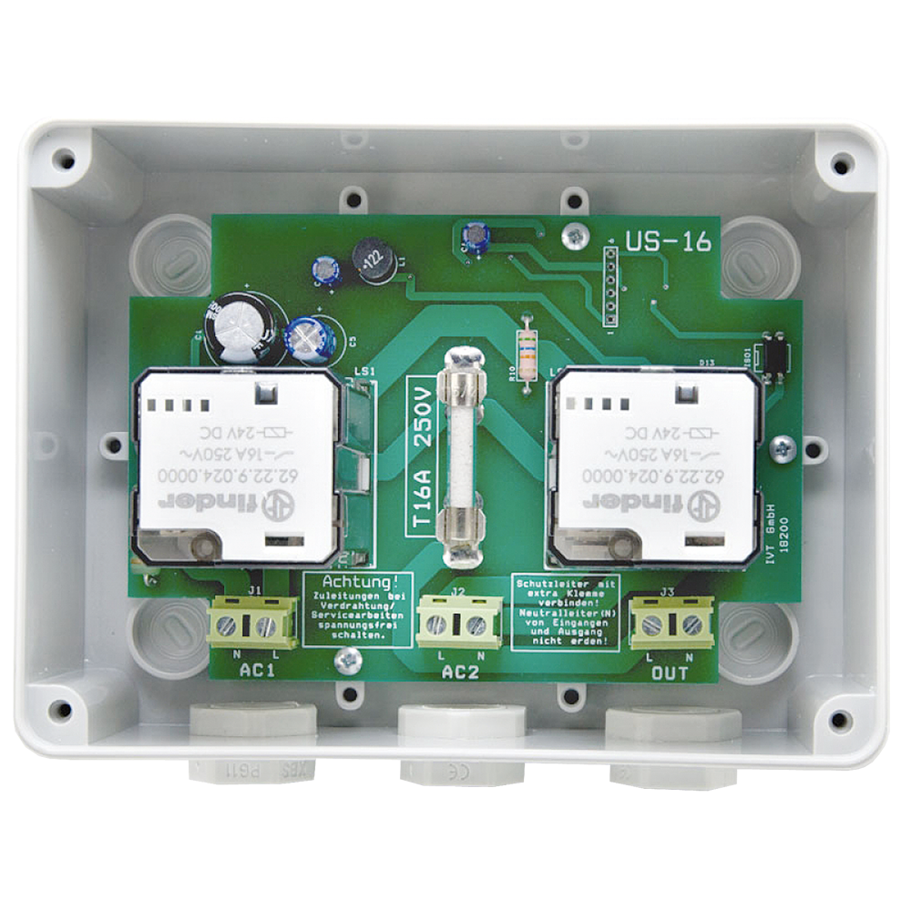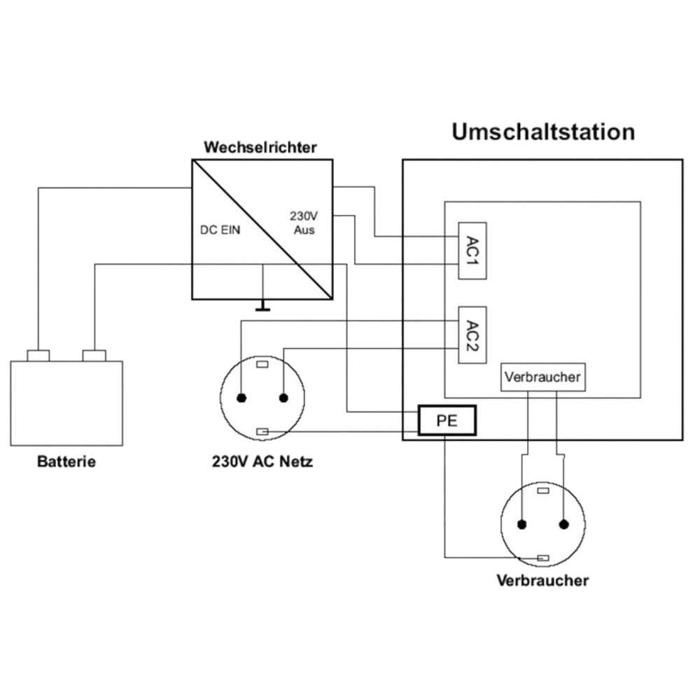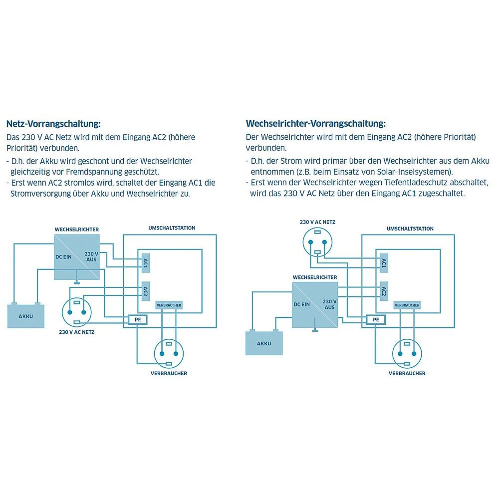 Die Umschaltstation für Wohnmobile, Boote, etc. ermöglicht die automatische Umschaltung zwischen zwei 230V AC-Quellen, beispielsweise in einem Wohnmobil zwischen dem eingebauten Wechselrichter und dem 230V Stromnetz (auf dem Campingplatz). Mit der Prioritätsschaltung kann festgelegt werden, welche Spannungsquelle bevorzugt verwendet werden soll – fällt diese Spannungsquelle aus, schaltet die Umschaltstation automatisch auf die Ersatzspannungsquelle um.