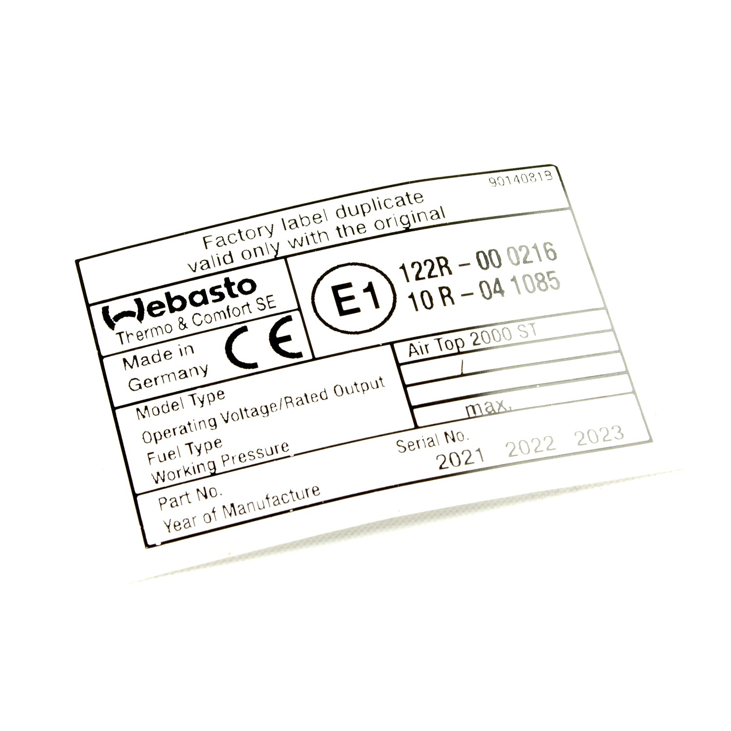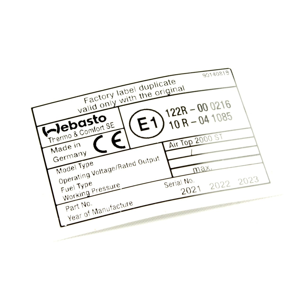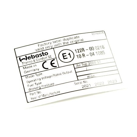 Dieses originale Webasto Blanko-Typschild ist der perfekte Helfer für deine Air Top 2000 ST Standheizung. Es ist selbstklebend und kinderleicht anzubringen, damit deine Heizung immer ordnungsgemäß gekennzeichnet ist. Ideal für Heizgeräte mit e1-Kennzeichnung, passt es perfekt zu den Modellen Air Top 2000/S/ST/STC. Ein kleines, aber feines Detail, das deine Heizung glänzen lässt!