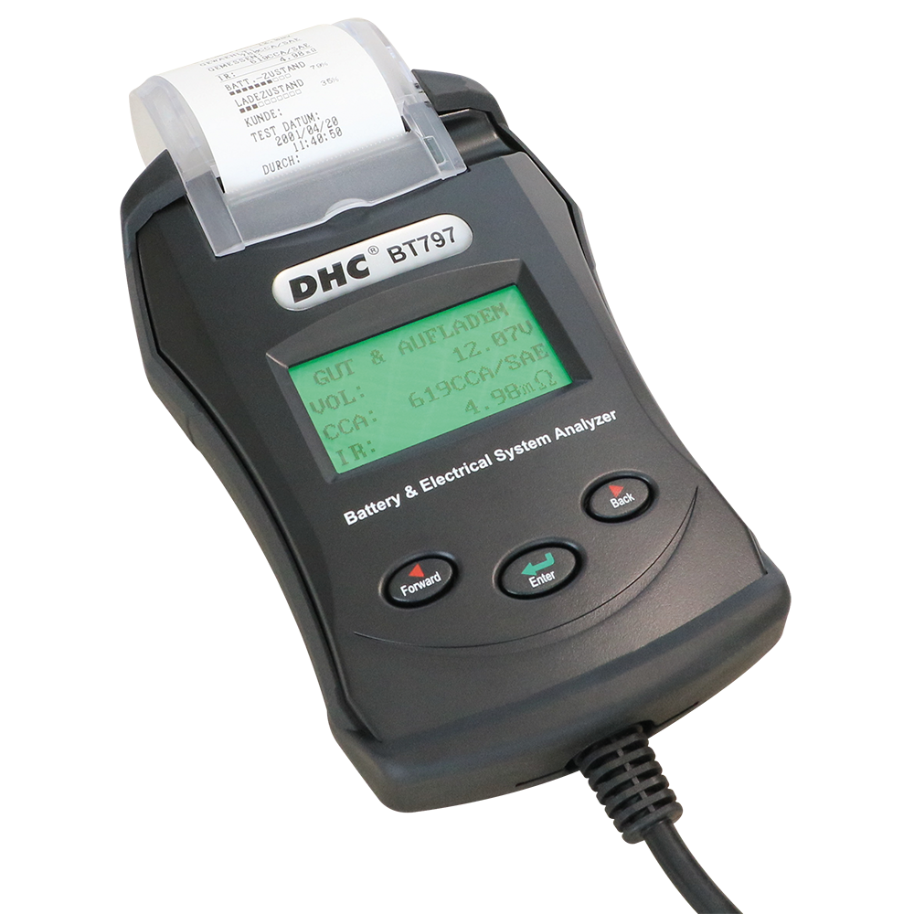 Professionelles Batterietestgerät mit eingebautem Thermo-Drucker zum Testen folgender Batterie-Typen: • Flüssigbatterie (Blei-Säure Akku) • AGM Flat • AGM Spiral •...