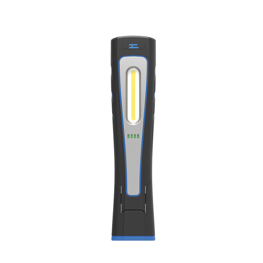 Robuste COB-LED Handlampe MAXI mit kabellosem Induktiv Ladesystem, Befestigungsmöglichkeit durch starken Magnet-Fuss mit 180° Klapp-Mechanismus sowie 2 Magnethaltern plus Haken auf der Rückseite. Keine anfälligen Ladebuchsen mehr, zudem ist die Leuchte auf dem Ladepad immer am selben Platz griffbereit und geladen.