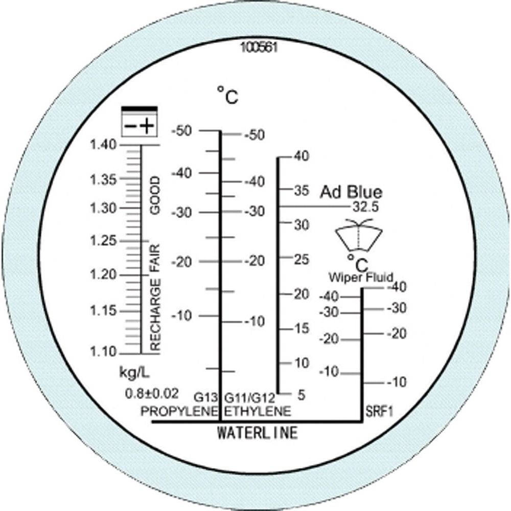 Refraktometer für diverse Flüssigkeiten wie Frostschutz, Akku-/Batteriesäure, AdBlue & Scheibenreiniger Aethylenglykol: -50° C...0° C Propylenglykol: -50° C...0° C Batteriesäuredichte: 1.10...1.4sg...