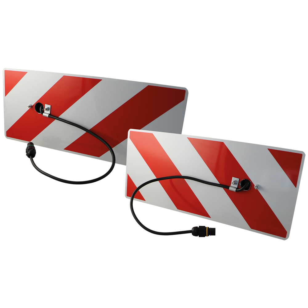 Satz für Überbreitemarkierung bestehend aus: - 2 rot/weiss-schraffiertenTafeln (400 x 165 mm), beidseitig bedruckt und reflektierend - 2 LED-Schlussleuchten mit...