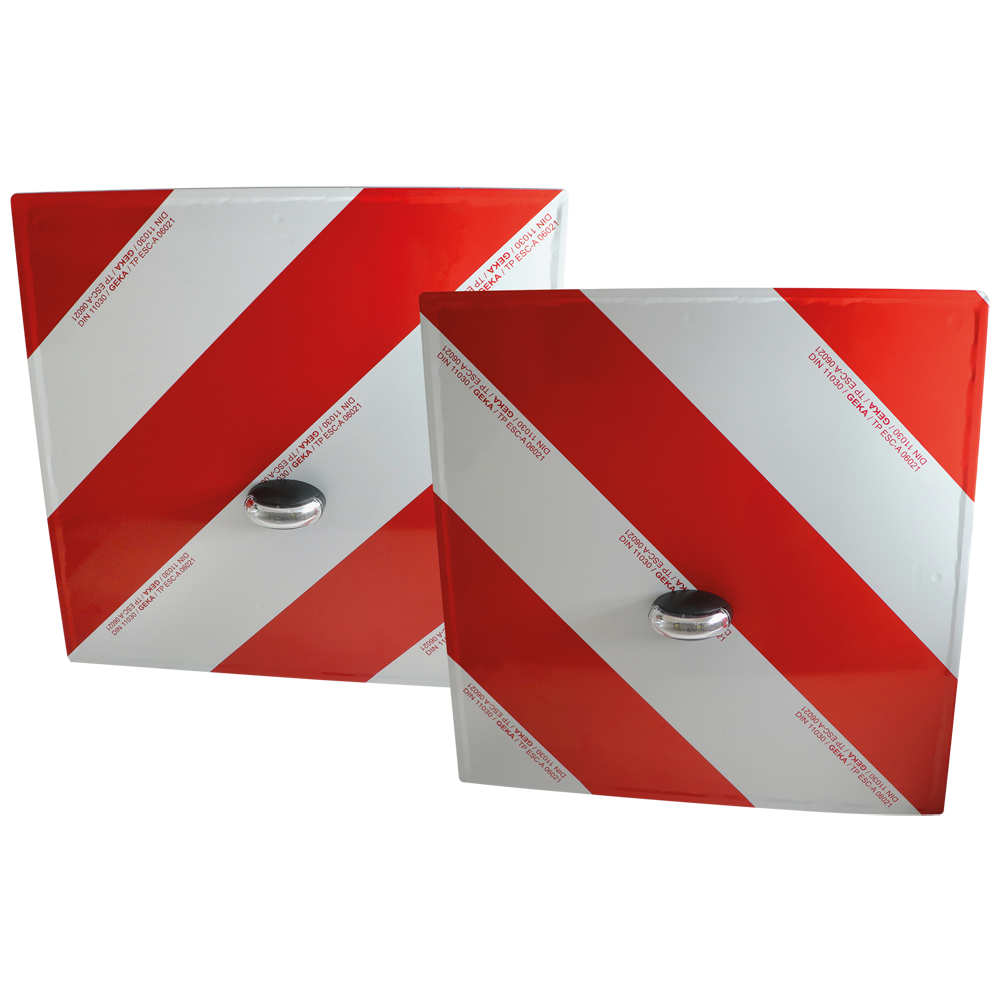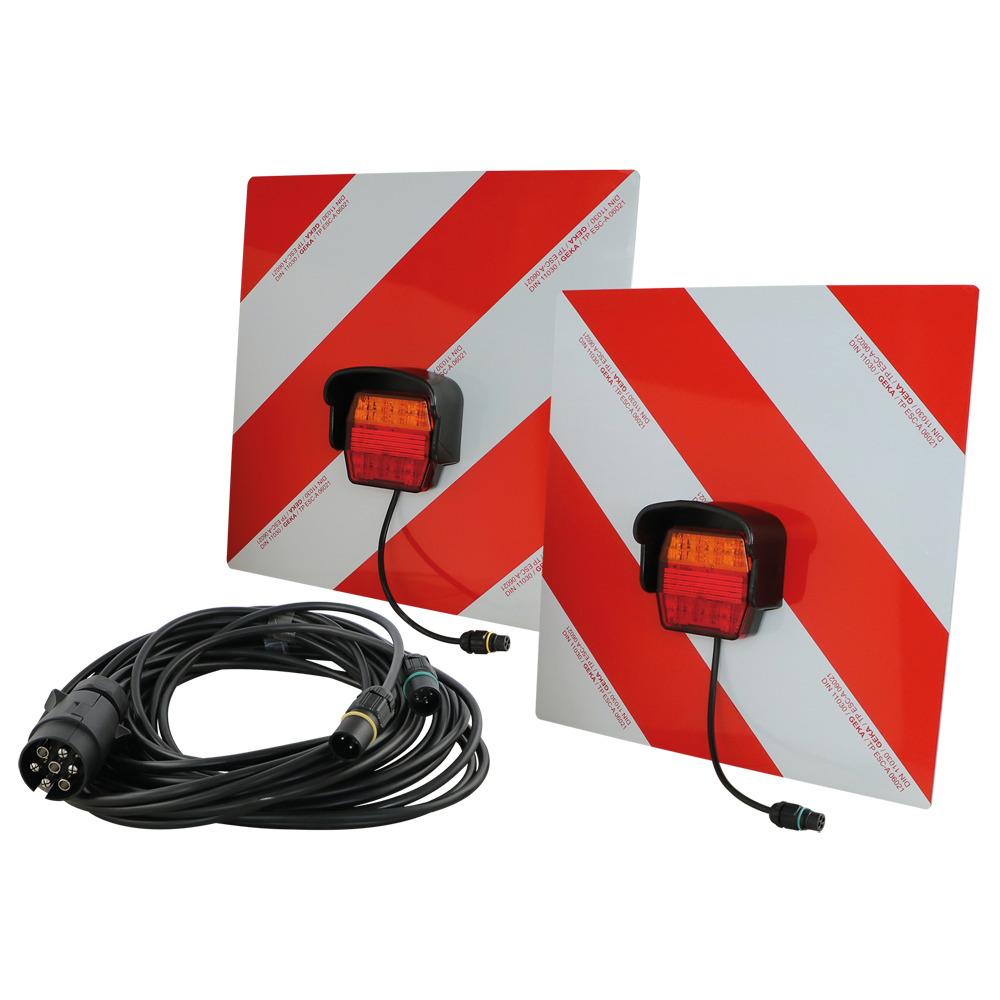 Satz für Überbreitemarkierung bestehend aus: - 2 rot/weiss-schraffiertenTafeln (423 x 423 mm), beidseitig bedruckt und reflektierend - 2 LED-Schlussleuchten mit...