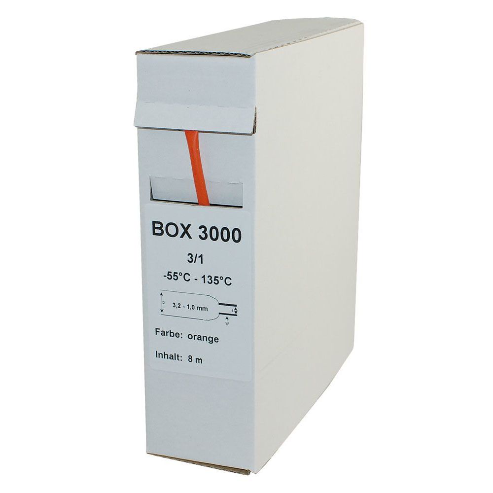 Schrumpfrate 3:1 Temp: -55°C bis + 135°C UV-beständigAbmessungenø 3.2 -> 1.0mm, 8m Box 3000