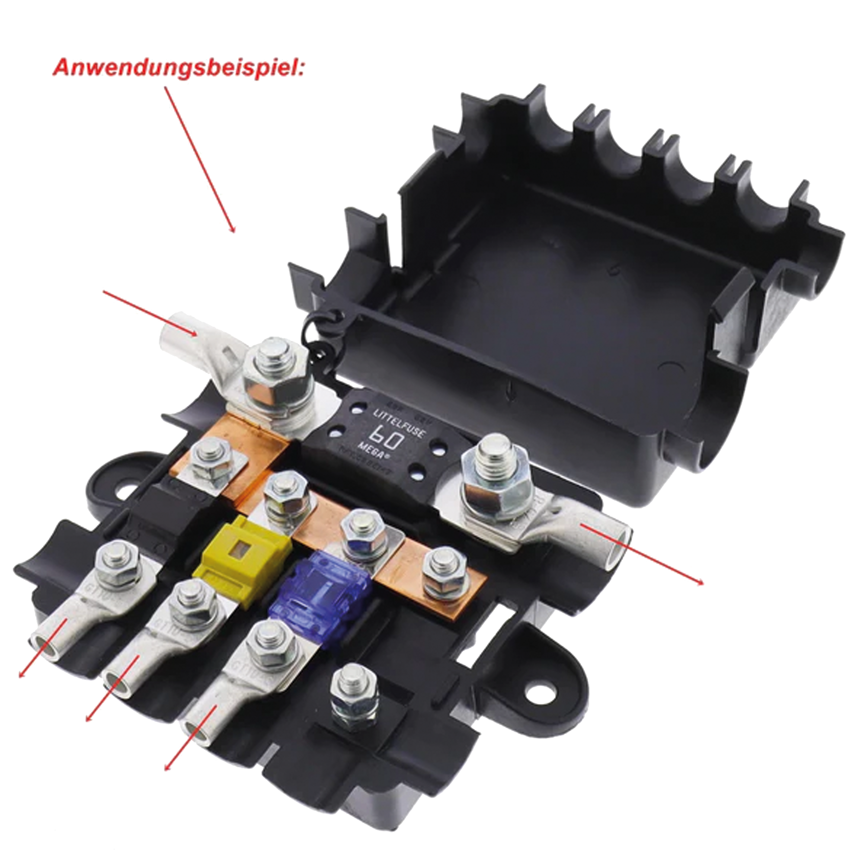 Midi: M5 Mega: M8 Bis 58 VAmpèreMidi: max. 4 x 200 A, Mega: bis 500 AAbmessungen96x80x39mmLochabstand115mm
