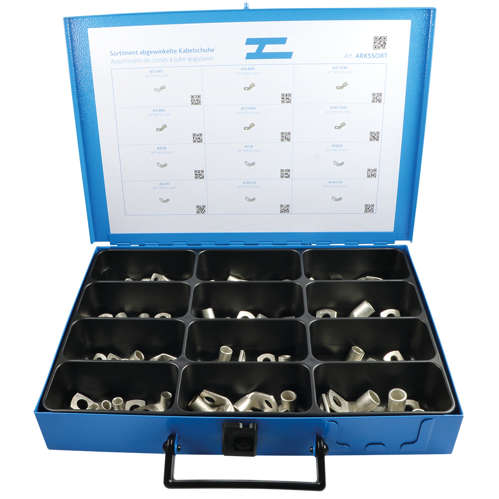 Sortiment abgewinkelte Rohrkabelschuhe im Metallkoffer mit 12 Fächern. Inhalt: 60 Stück assortierte abgewinkelte Rohrkabelschuhe (45°/90°) 45°: M6/25mm2 - M10/70mm2 90°:...